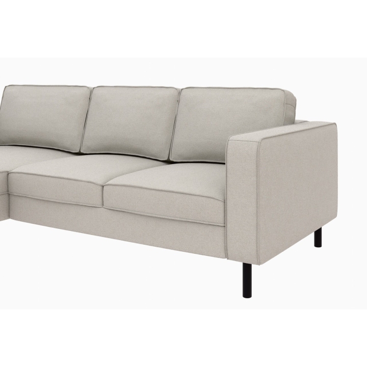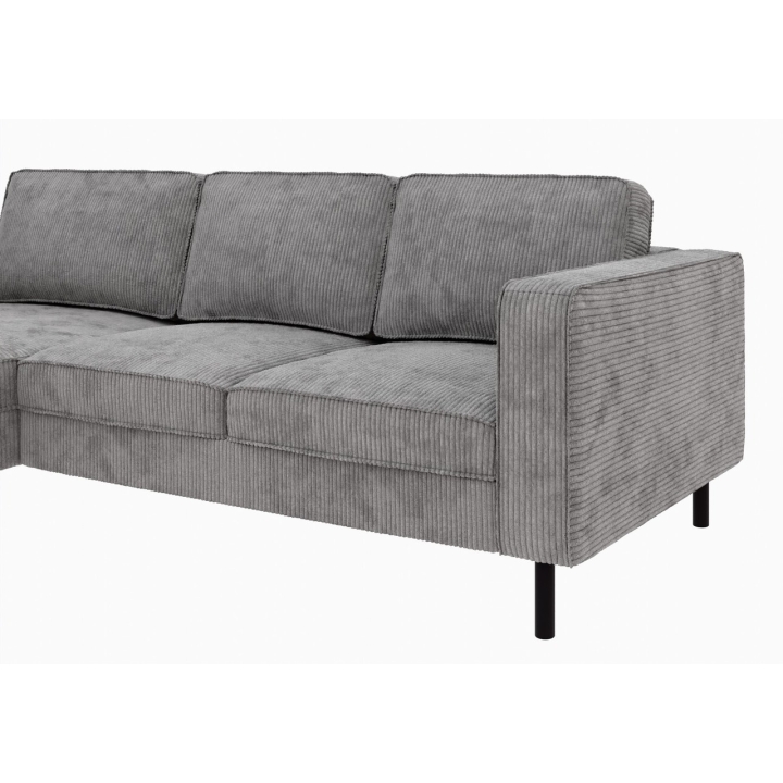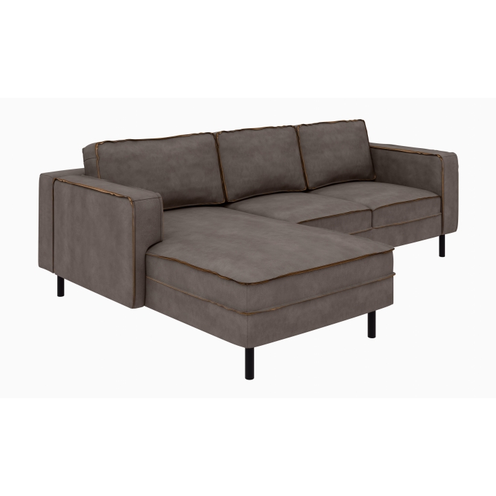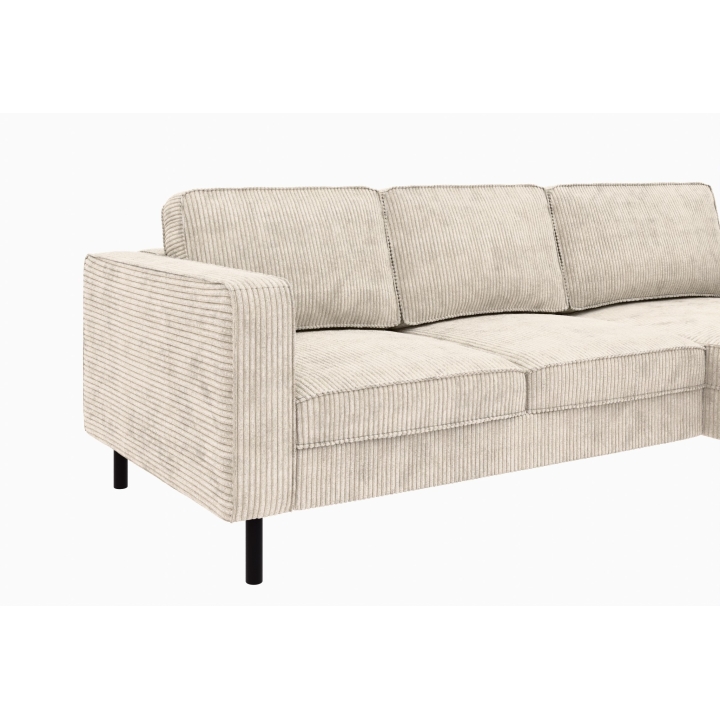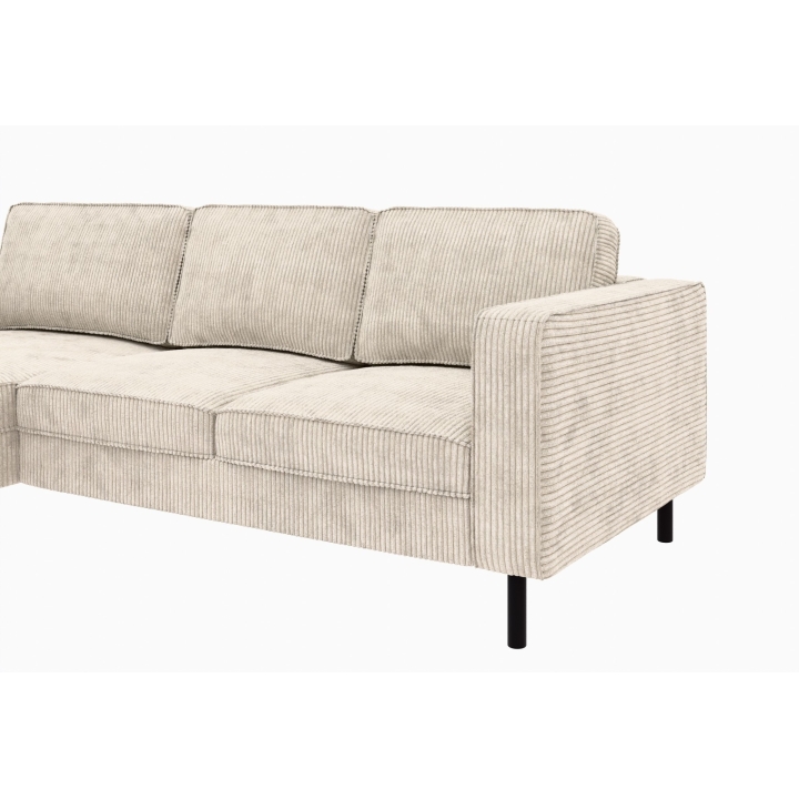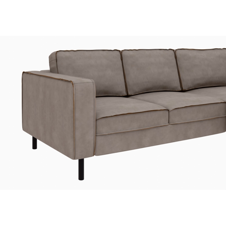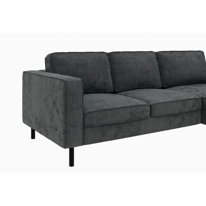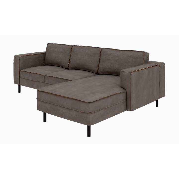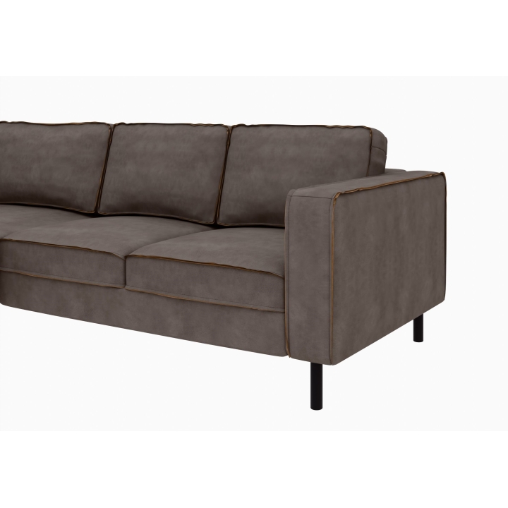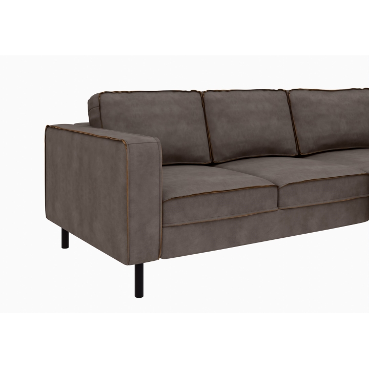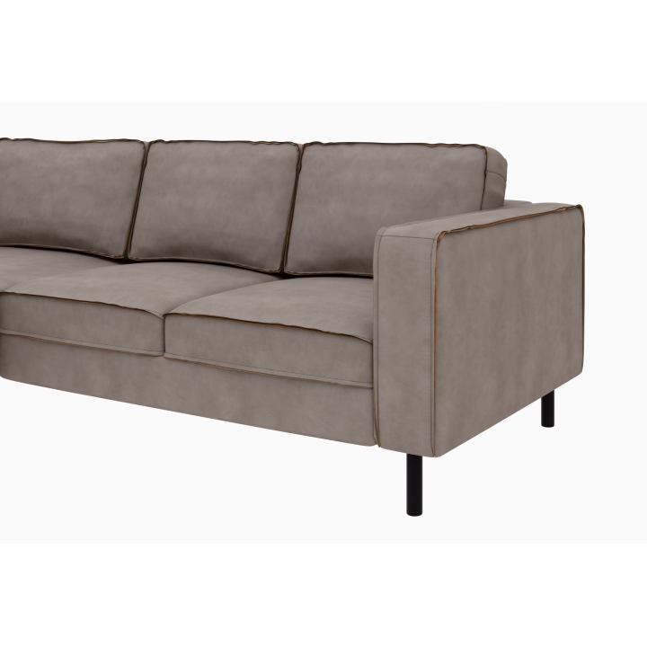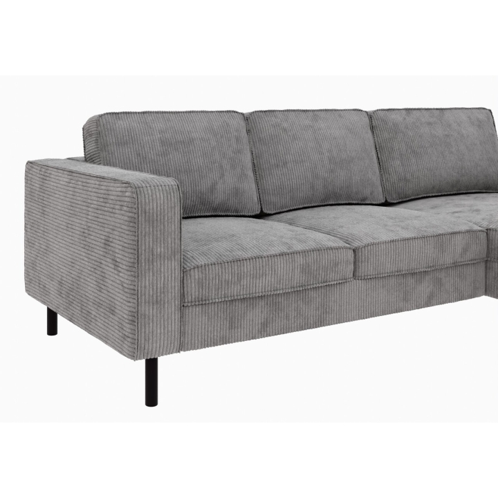 Mebel wyróżnia się charakterystycznym szwem, który można wybrać w wersji otwartej lub francuskiej (opcja dostępna za dodatkową opłatą w celu jej wyboru skontaktuj się z działem obsługi klienta). Całość osadzona jest na czarnych, matowych nogach z tworzywa o wysokości 15 cm, nadających bryle lekkości. Zastosowanie wysokiej nogi ułatwia także utrzymanie czystości pod narożnikiem.
