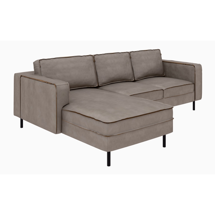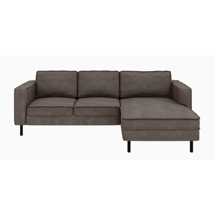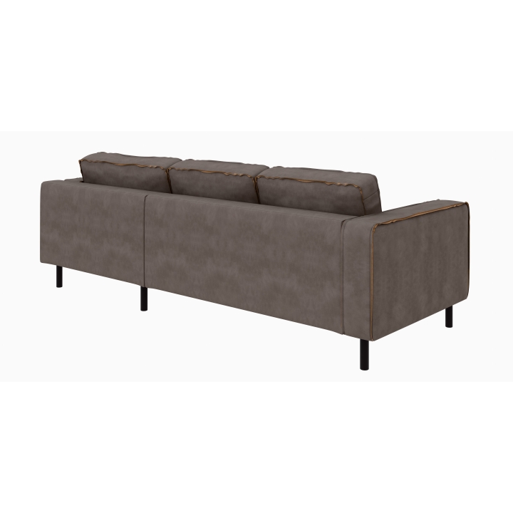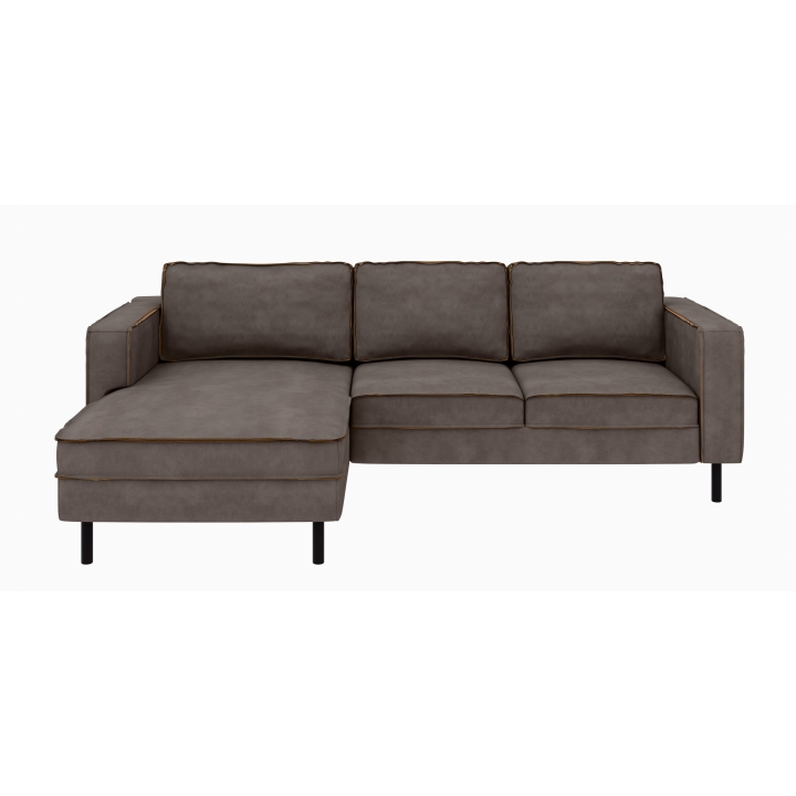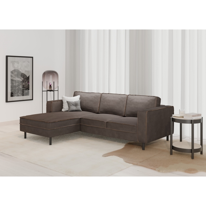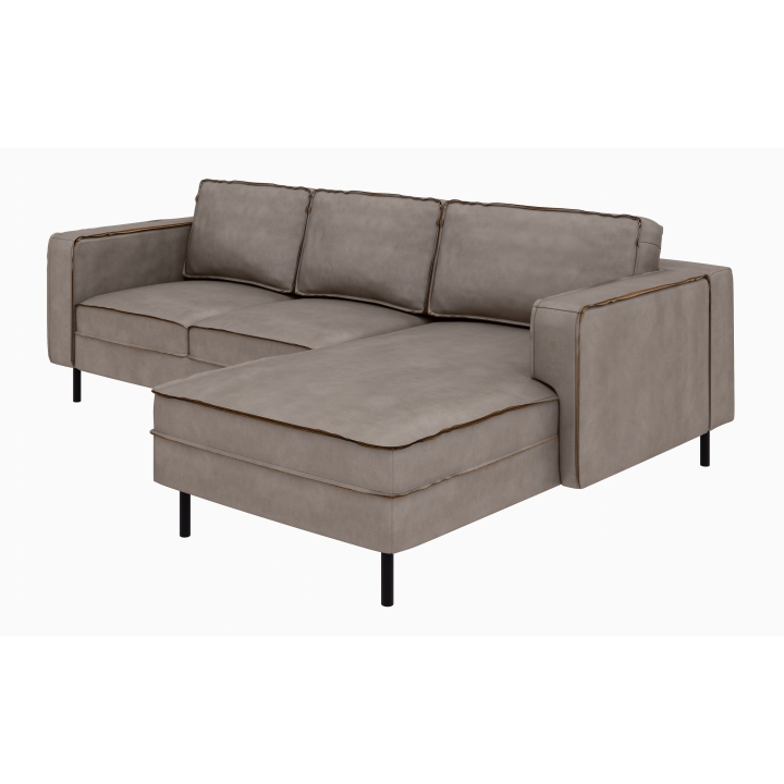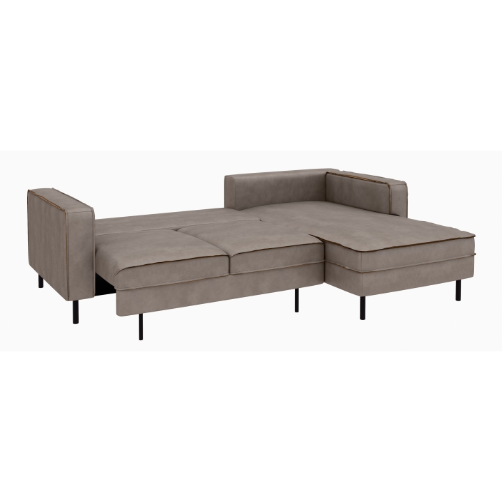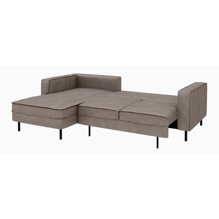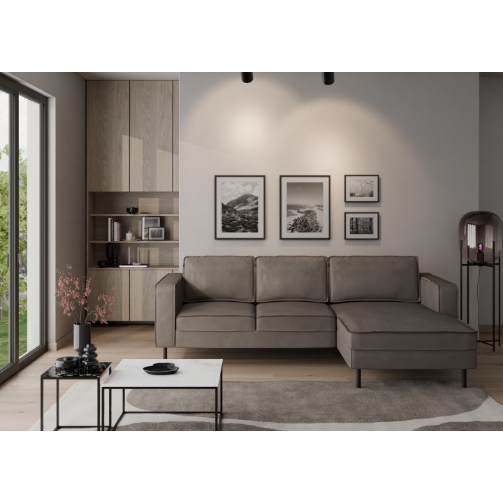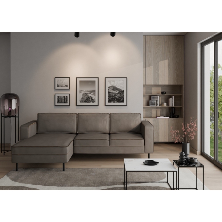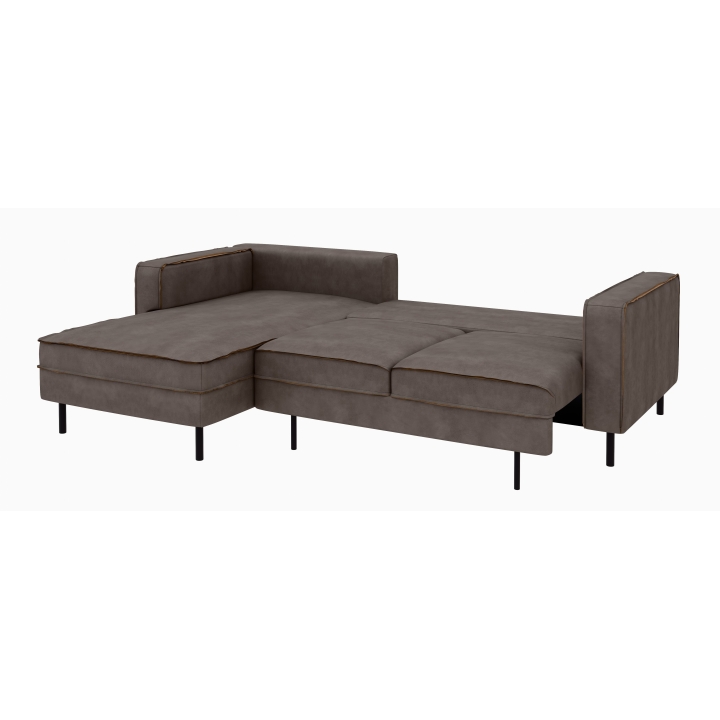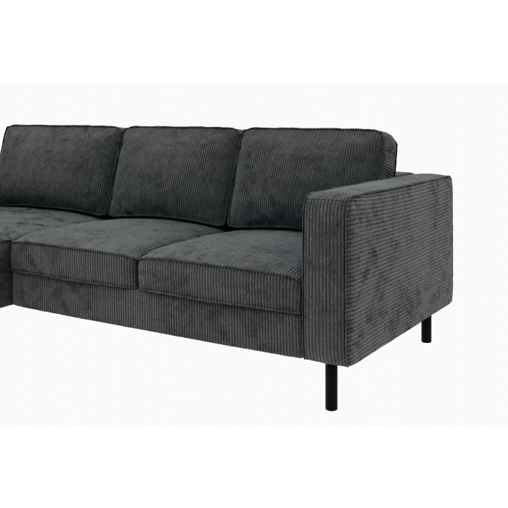 Mebel wyróżnia się charakterystycznym szwem, który można wybrać w wersji otwartej lub francuskiej (opcja dostępna za dodatkową opłatą w celu jej wyboru skontaktuj się z działem obsługi klienta). Całość osadzona jest na czarnych, matowych nogach z tworzywa o wysokości 15 cm, nadających bryle lekkości. Zastosowanie wysokiej nogi ułatwia także utrzymanie czystości pod narożnikiem.