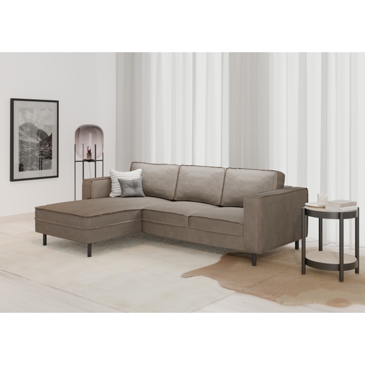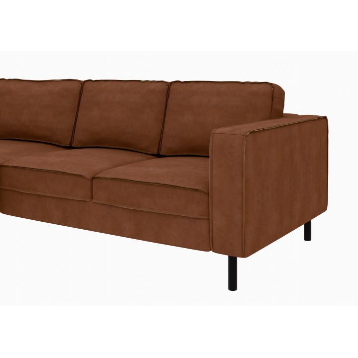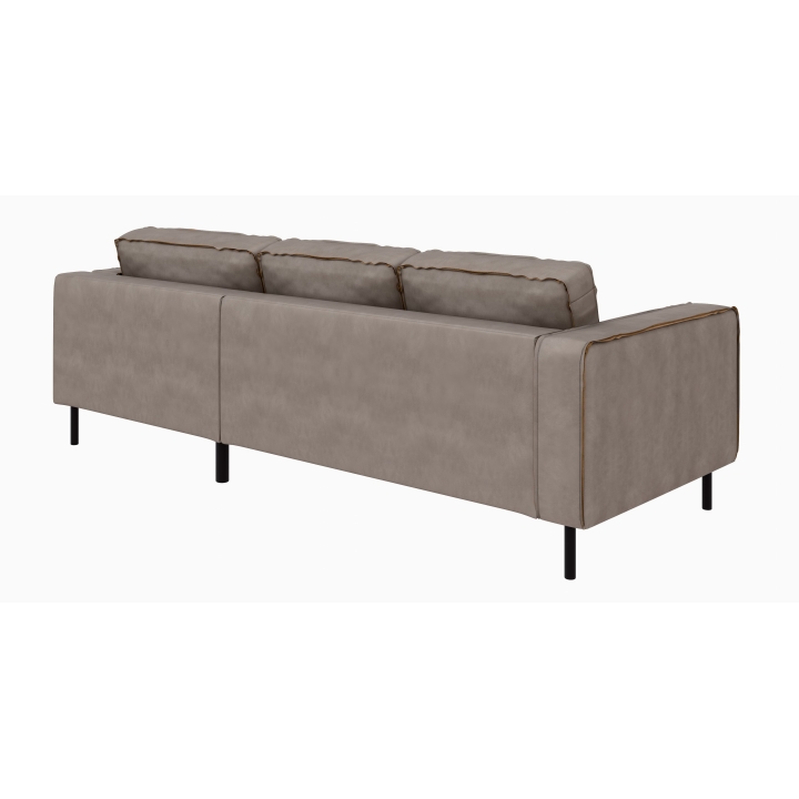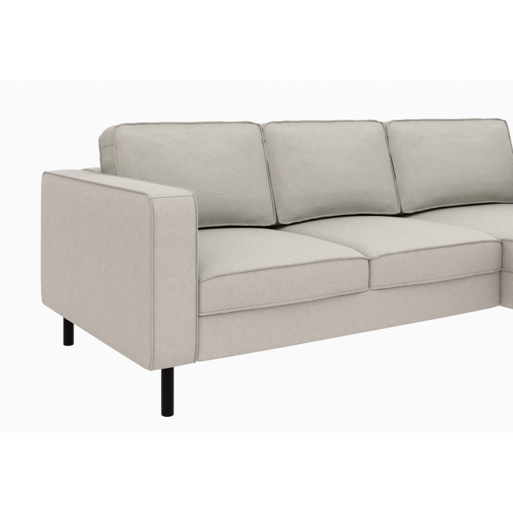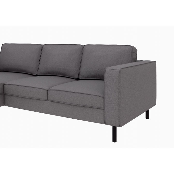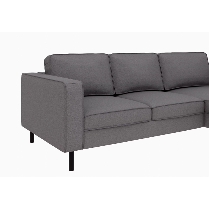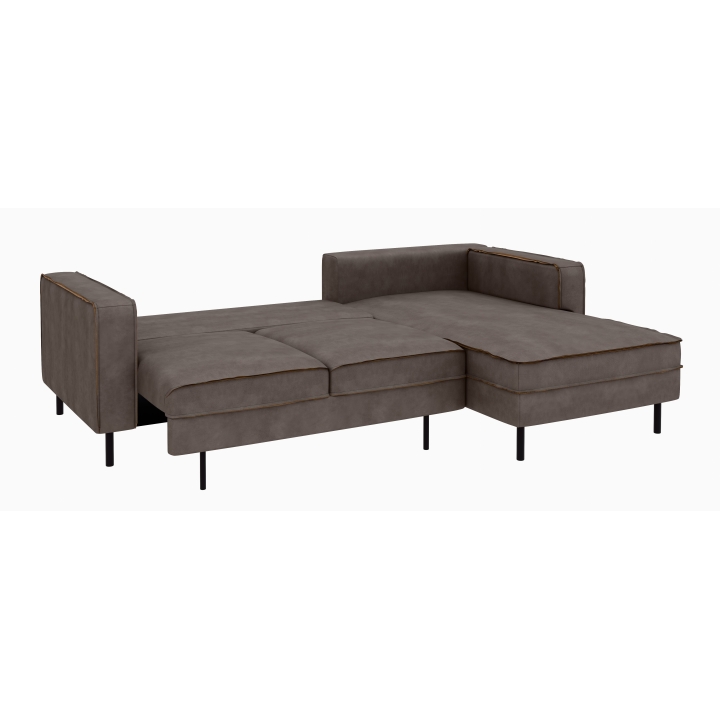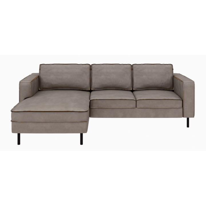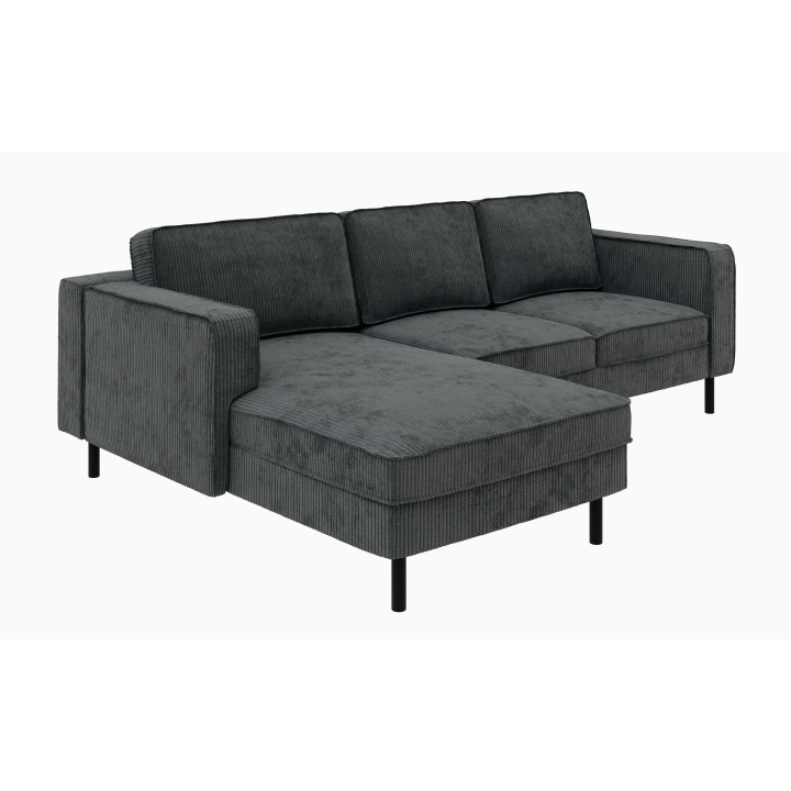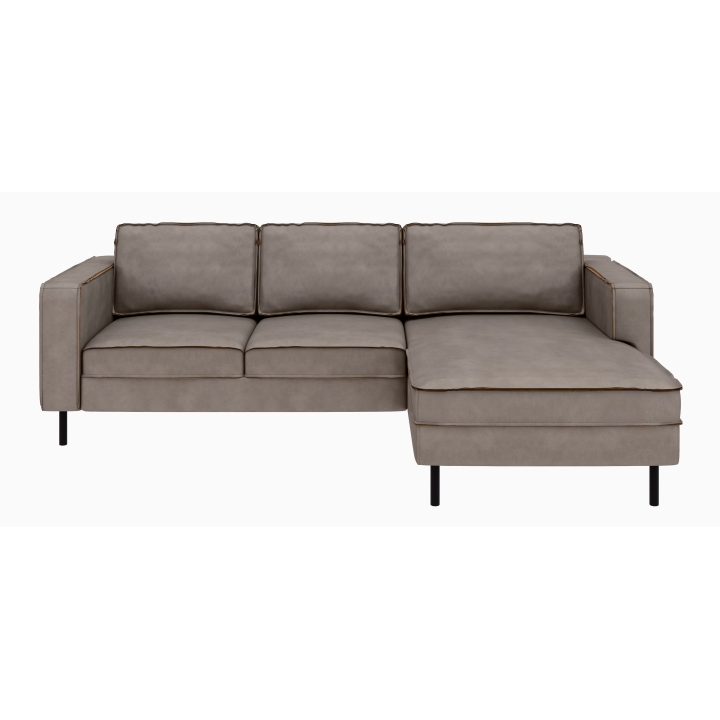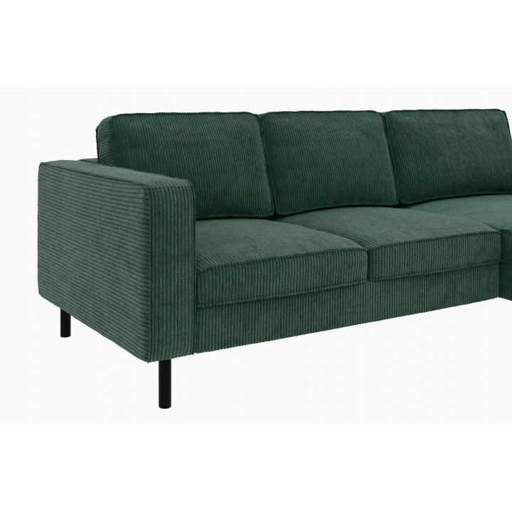 Mebel wyróżnia się charakterystycznym szwem, który można wybrać w wersji otwartej lub francuskiej (opcja dostępna za dodatkową opłatą w celu jej wyboru skontaktuj się z działem obsługi klienta). Całość osadzona jest na czarnych, matowych nogach z tworzywa o wysokości 15 cm, nadających bryle lekkości. Zastosowanie wysokiej nogi ułatwia także utrzymanie czystości pod narożnikiem.