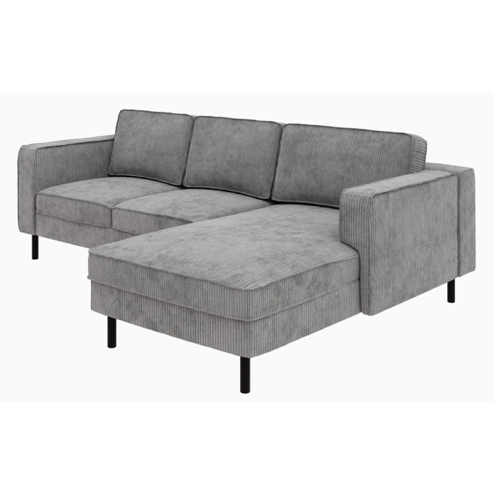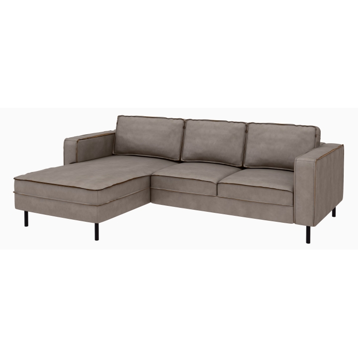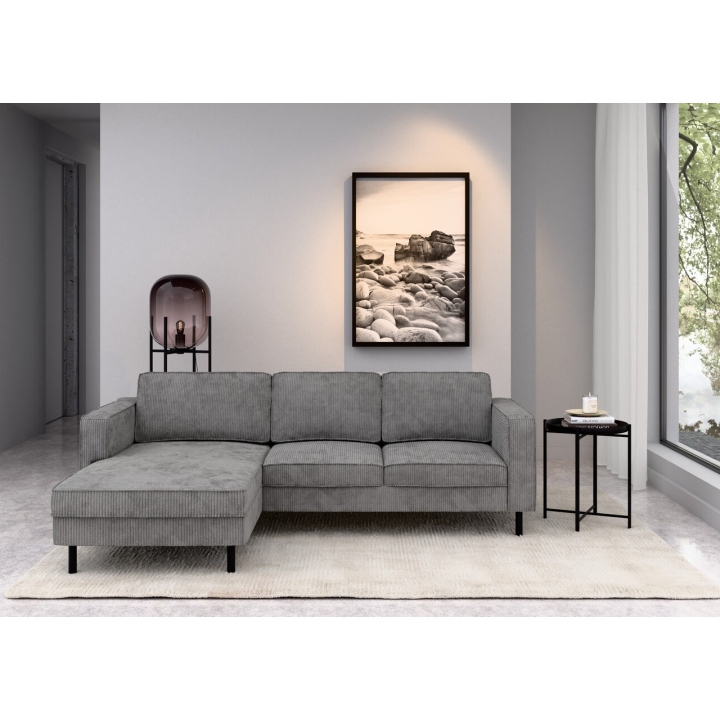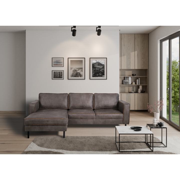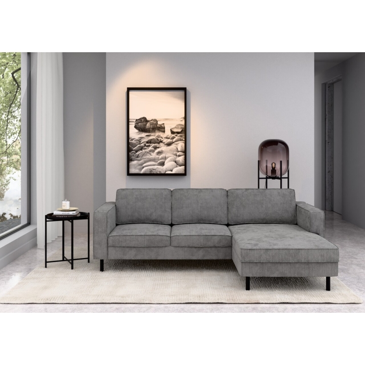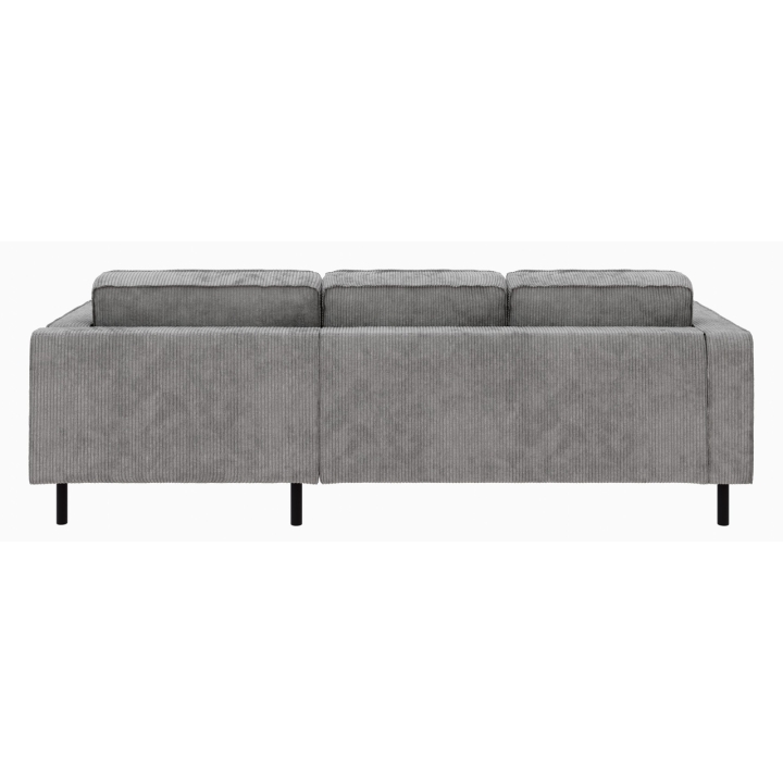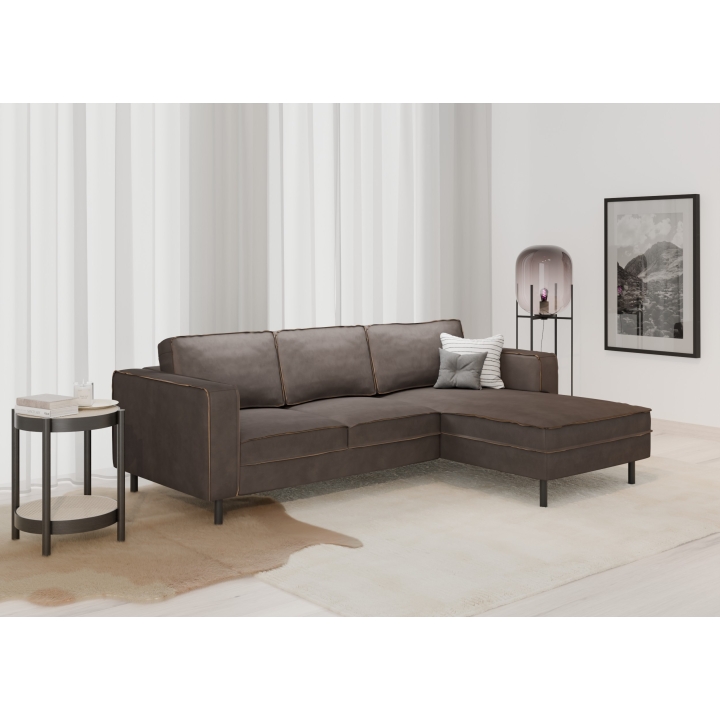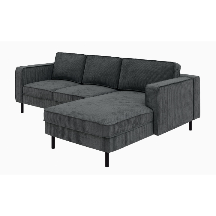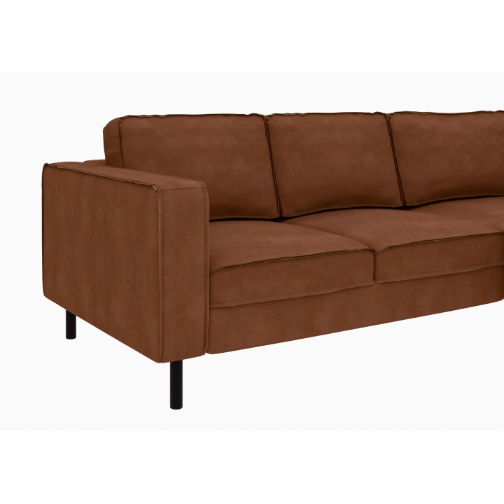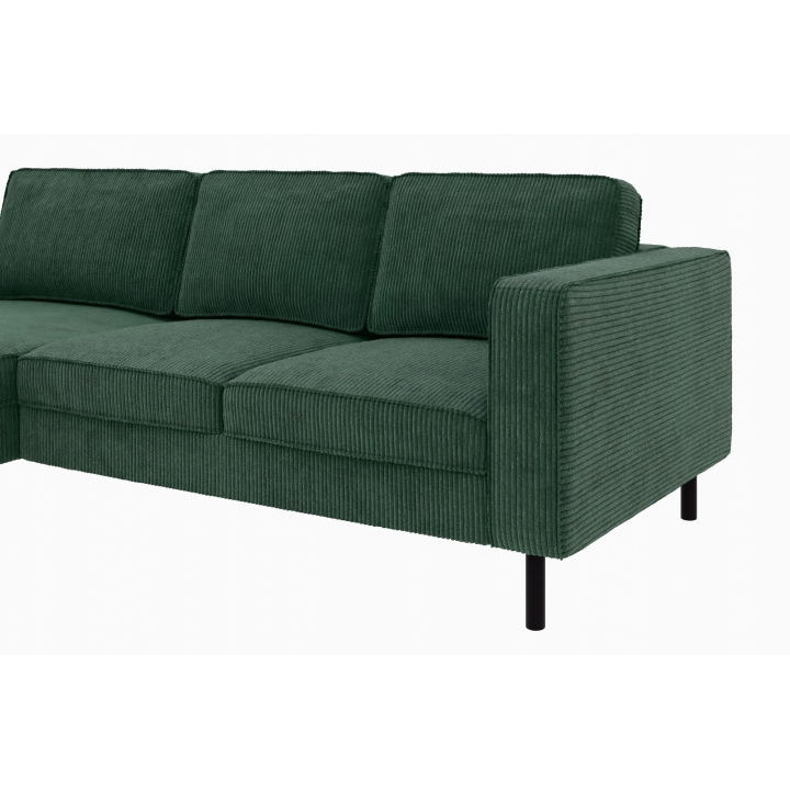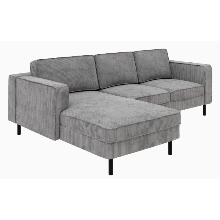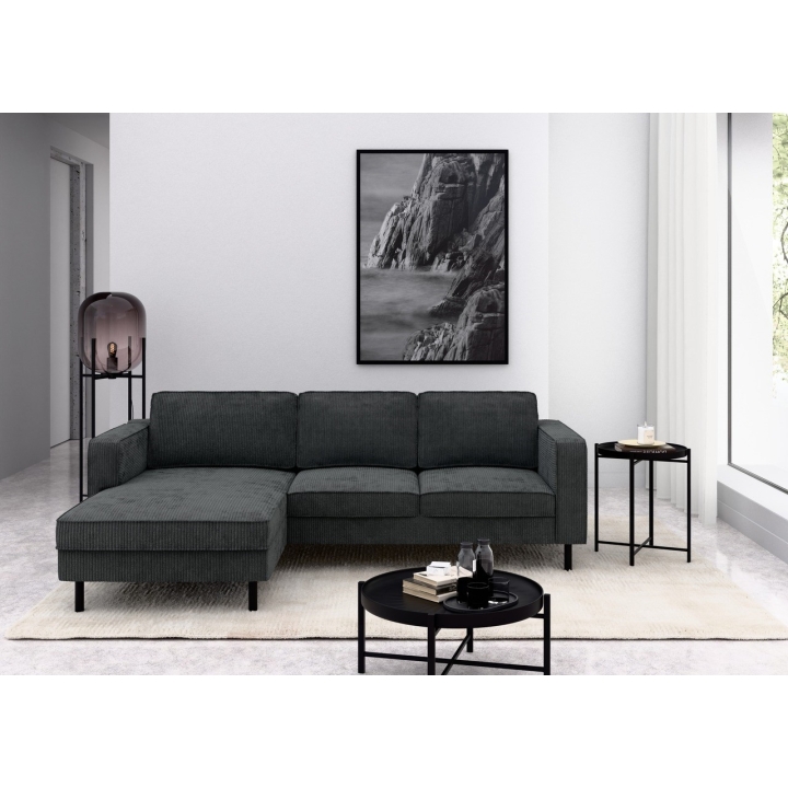 Mebel wyróżnia się charakterystycznym szwem, który można wybrać w wersji otwartej lub francuskiej (opcja dostępna za dodatkową opłatą w celu jej wyboru skontaktuj się z działem obsługi klienta). Całość osadzona jest na czarnych, matowych nogach z tworzywa o wysokości 15 cm, nadających bryle lekkości. Zastosowanie wysokiej nogi ułatwia także utrzymanie czystości pod narożnikiem.
