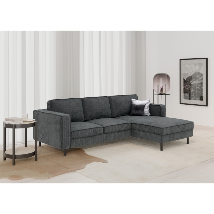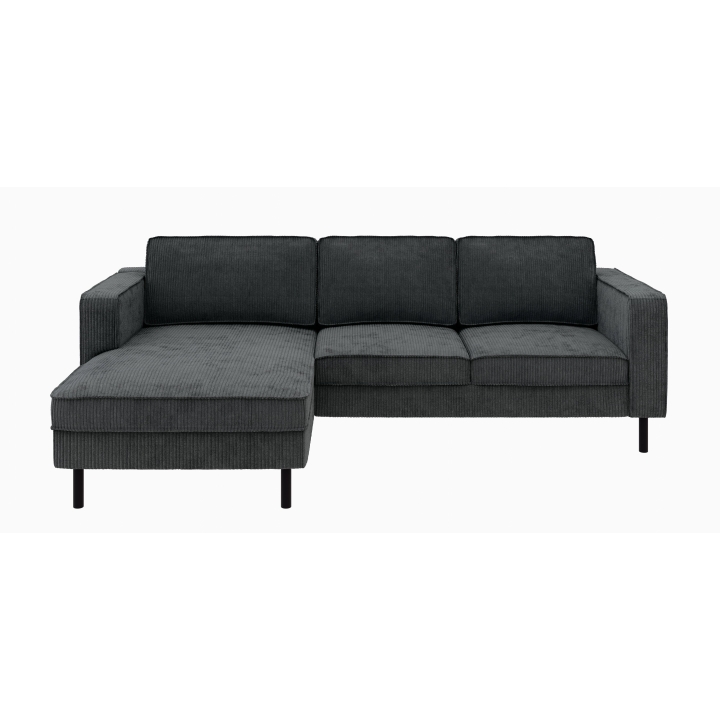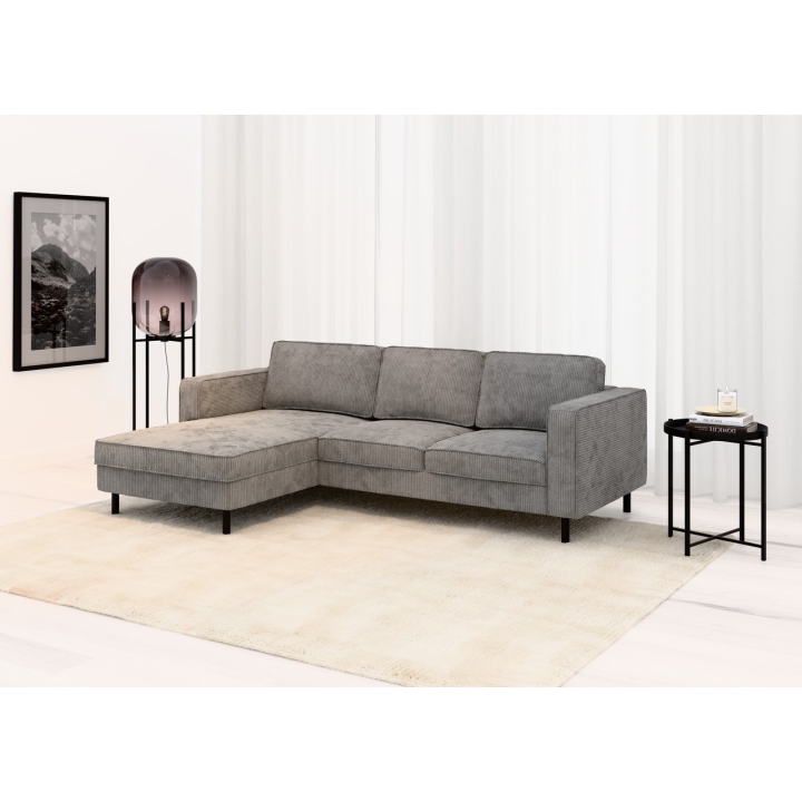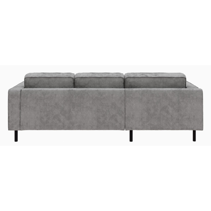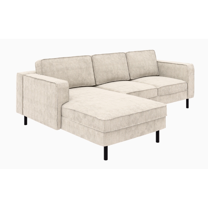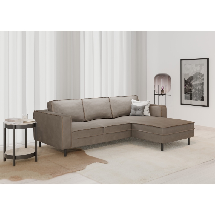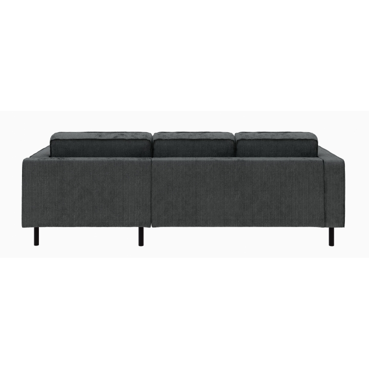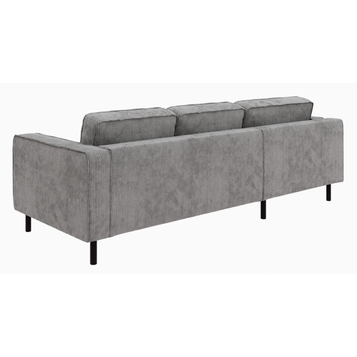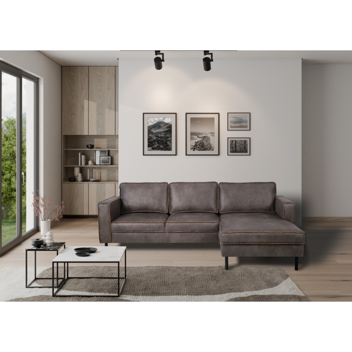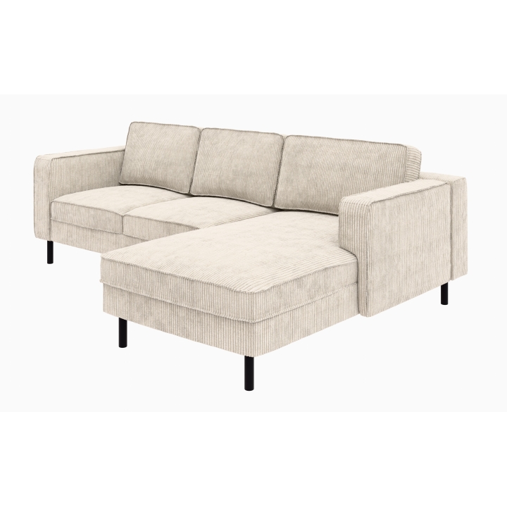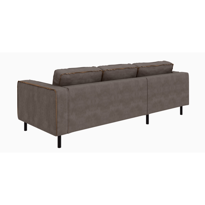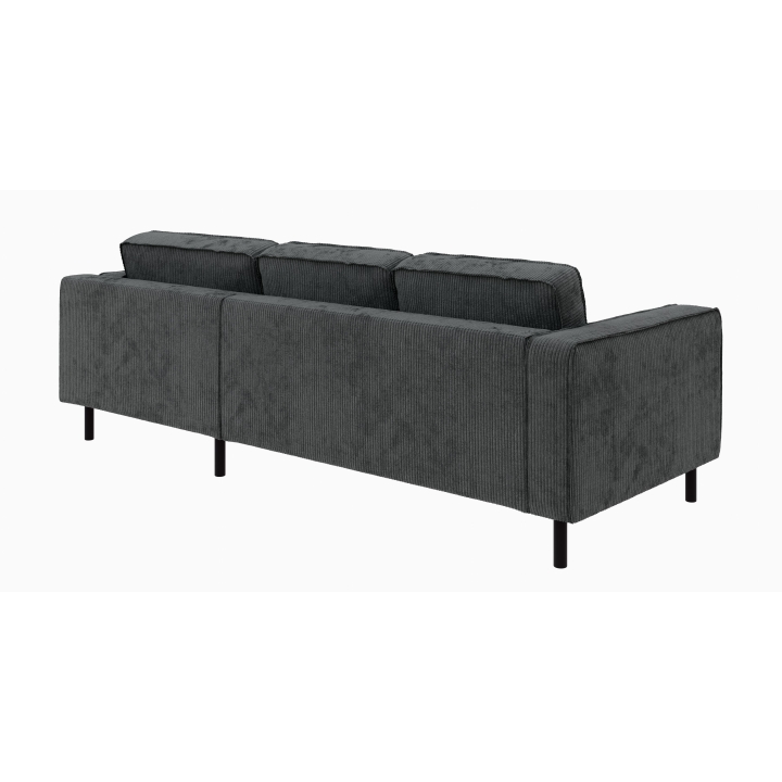 Mebel wyróżnia się charakterystycznym szwem, który można wybrać w wersji otwartej lub francuskiej (opcja dostępna za dodatkową opłatą w celu jej wyboru skontaktuj się z działem obsługi klienta). Całość osadzona jest na czarnych, matowych nogach z tworzywa o wysokości 15 cm, nadających bryle lekkości. Zastosowanie wysokiej nogi ułatwia także utrzymanie czystości pod narożnikiem.