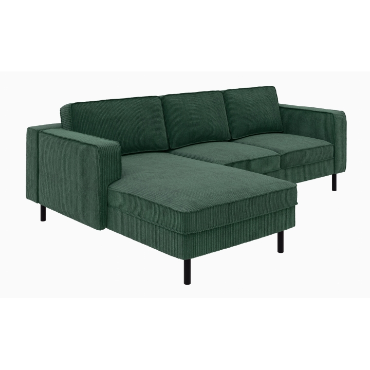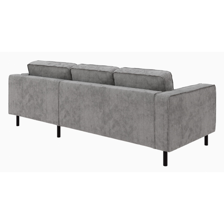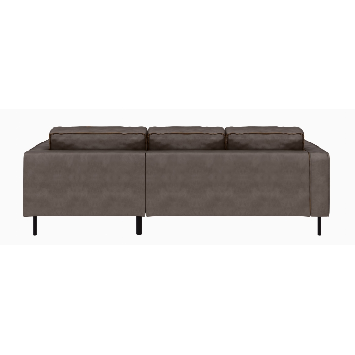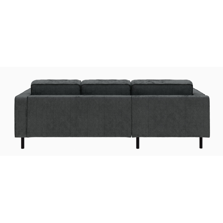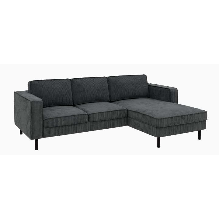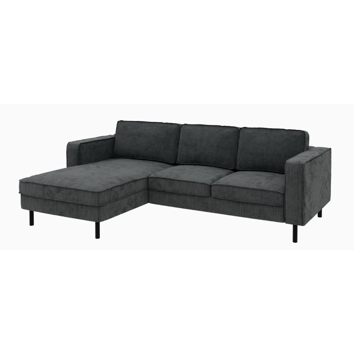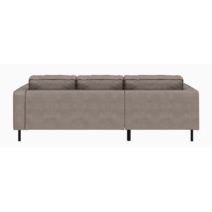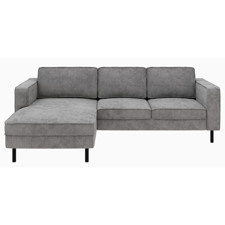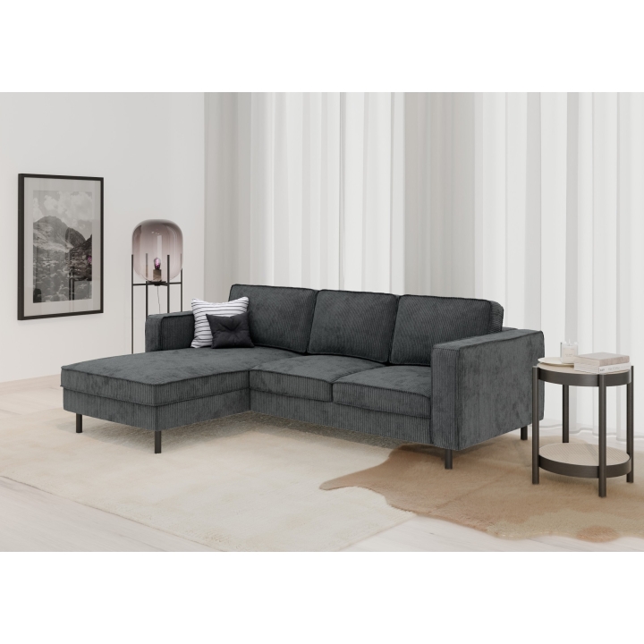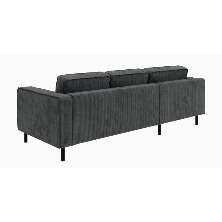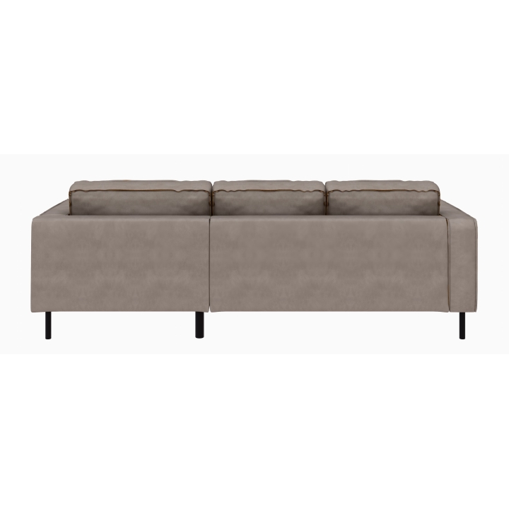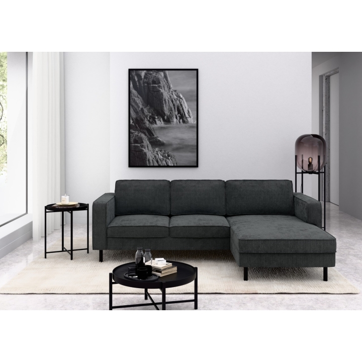Mebel wyróżnia się charakterystycznym szwem, który można wybrać w wersji otwartej lub francuskiej (opcja dostępna za dodatkową opłatą w celu jej wyboru skontaktuj się z działem obsługi klienta). Całość osadzona jest na czarnych, matowych nogach z tworzywa o wysokości 15 cm, nadających bryle lekkości. Zastosowanie wysokiej nogi ułatwia także utrzymanie czystości pod narożnikiem.