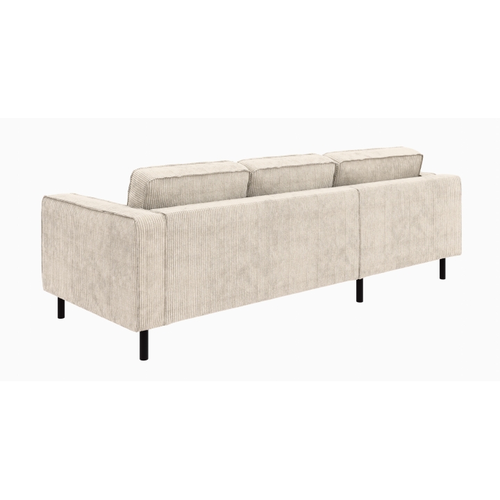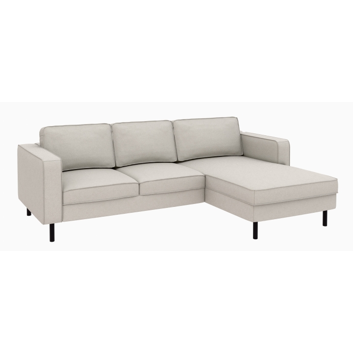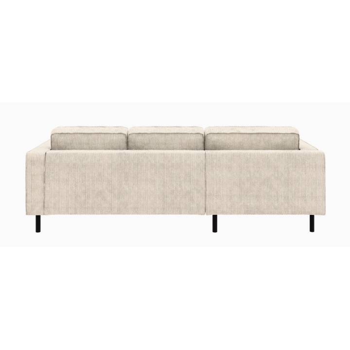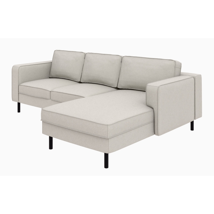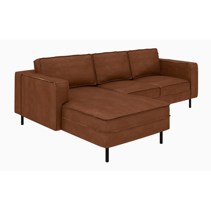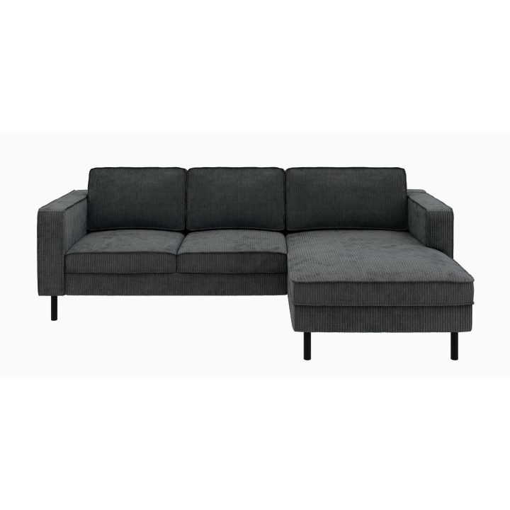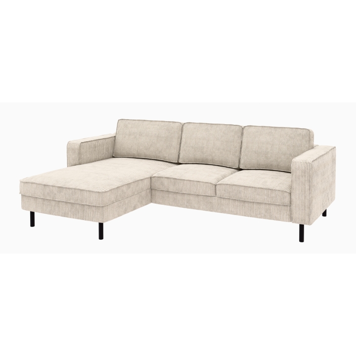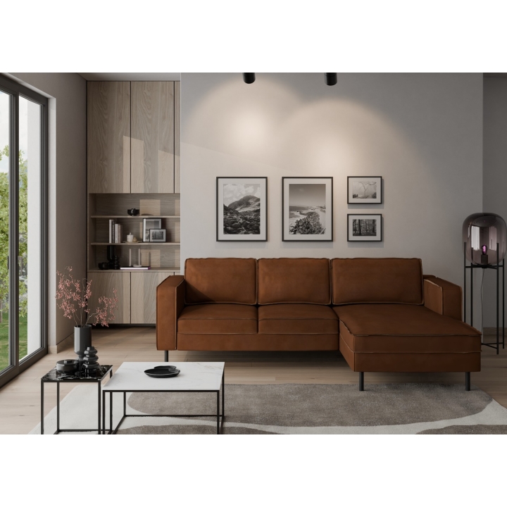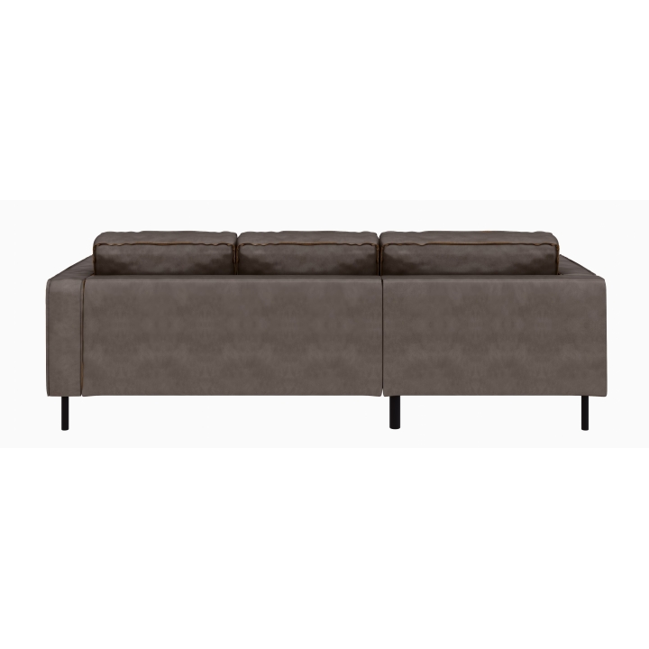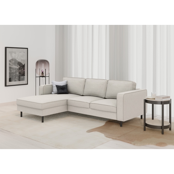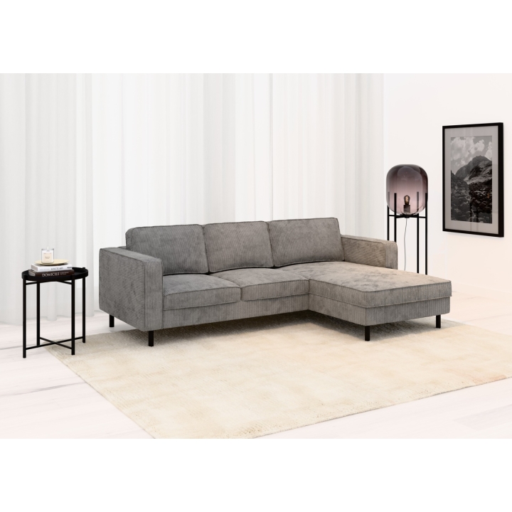 Mebel wyróżnia się charakterystycznym szwem, który można wybrać w wersji otwartej lub francuskiej (opcja dostępna za dodatkową opłatą w celu jej wyboru skontaktuj się z działem obsługi klienta). Całość osadzona jest na czarnych, matowych nogach z tworzywa o wysokości 15 cm, nadających bryle lekkości. Zastosowanie wysokiej nogi ułatwia także utrzymanie czystości pod narożnikiem.