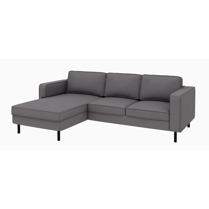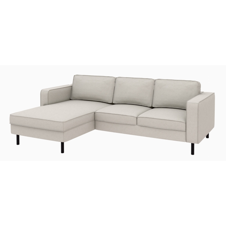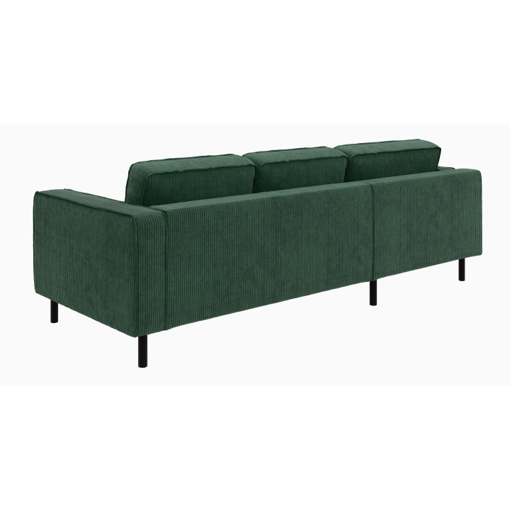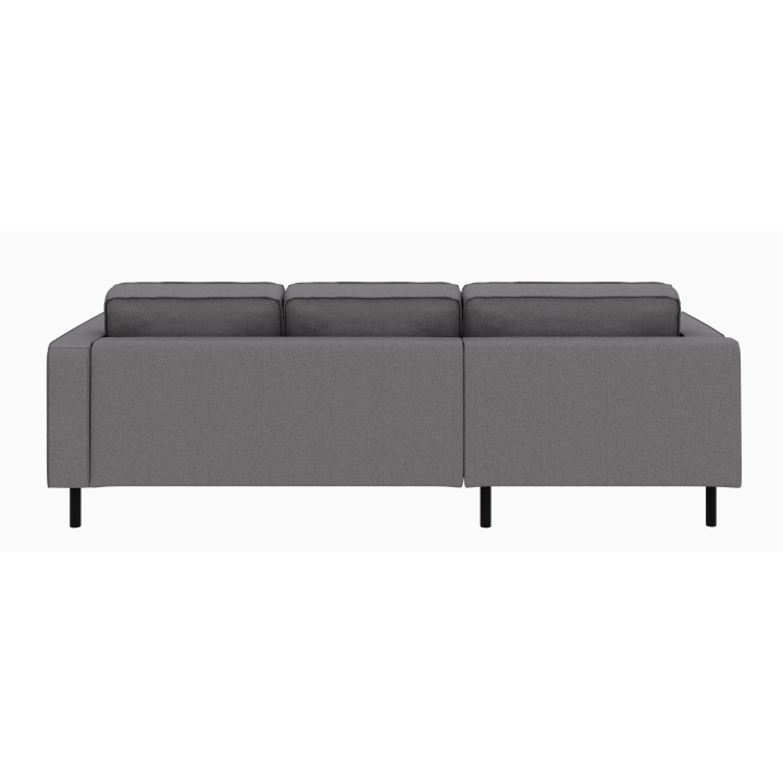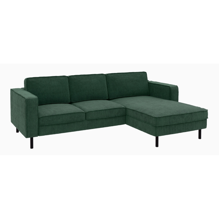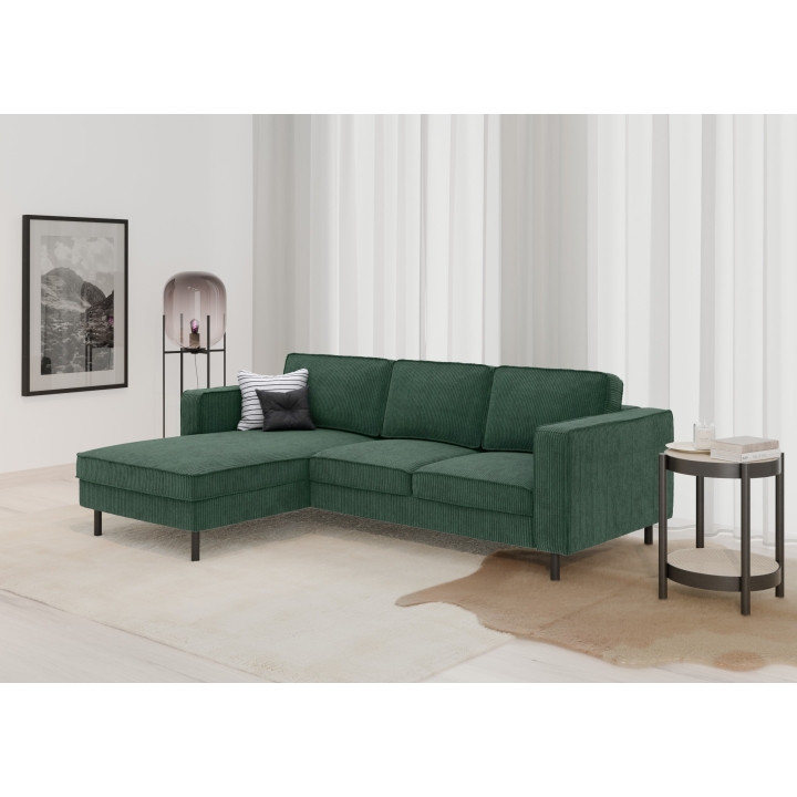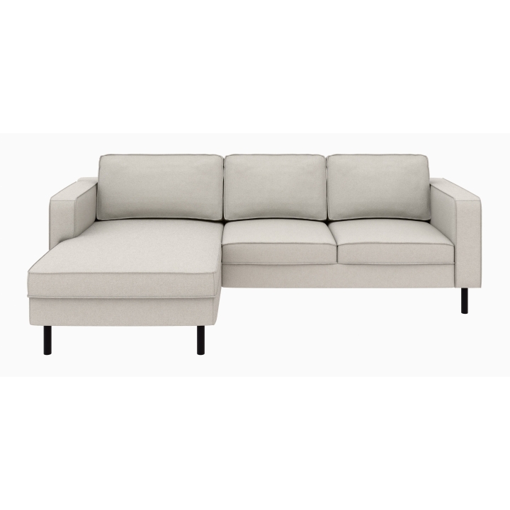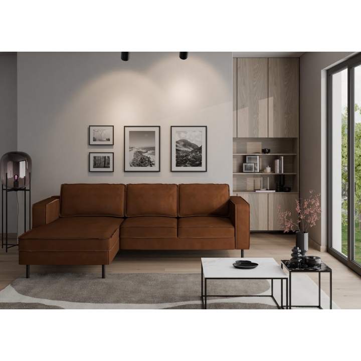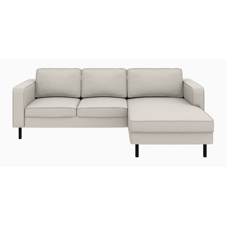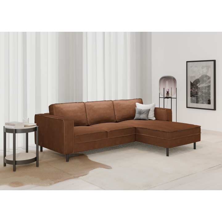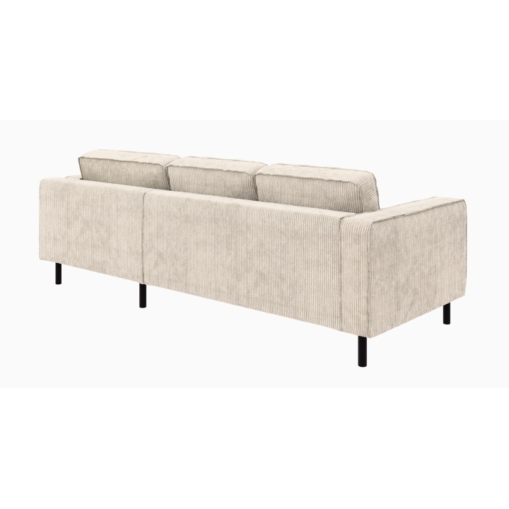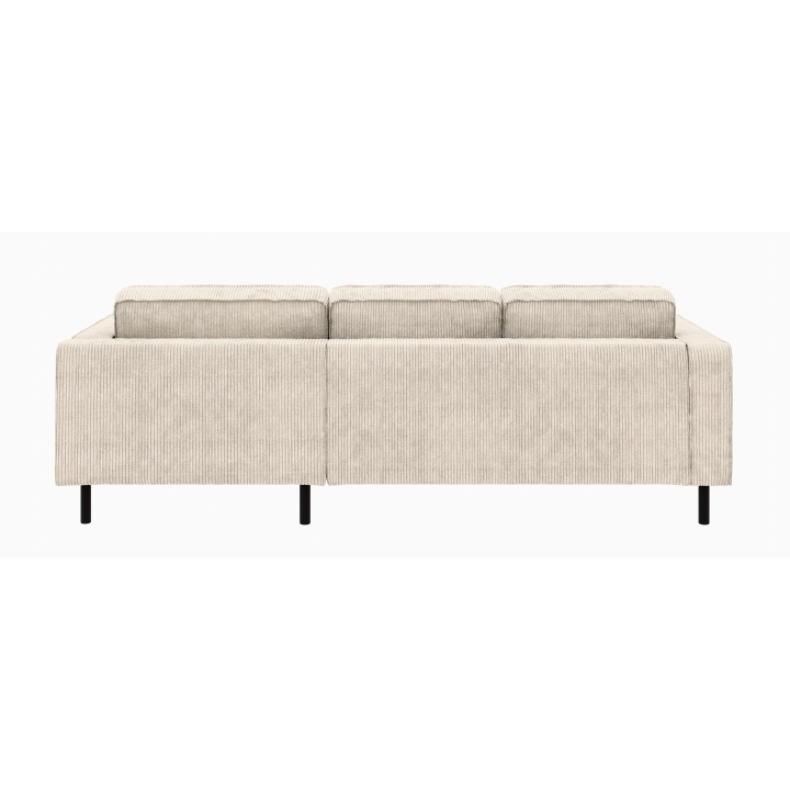 Mebel wyróżnia się charakterystycznym szwem, który można wybrać w wersji otwartej lub francuskiej (opcja dostępna za dodatkową opłatą w celu jej wyboru skontaktuj się z działem obsługi klienta). Całość osadzona jest na czarnych, matowych nogach z tworzywa o wysokości 15 cm, nadających bryle lekkości. Zastosowanie wysokiej nogi ułatwia także utrzymanie czystości pod narożnikiem.