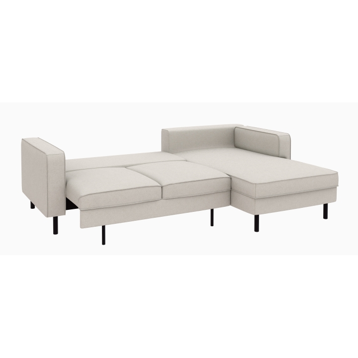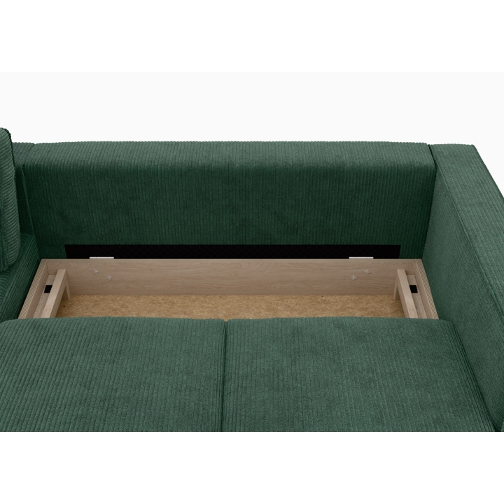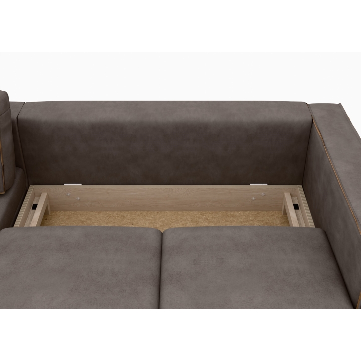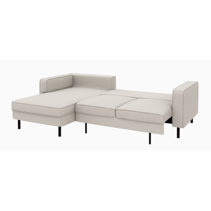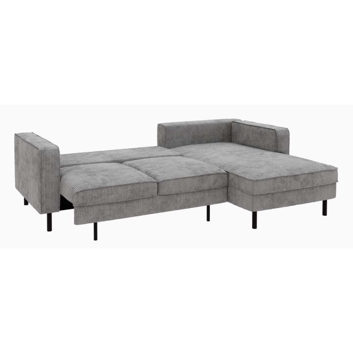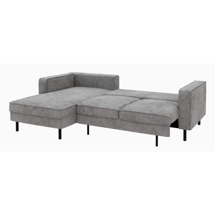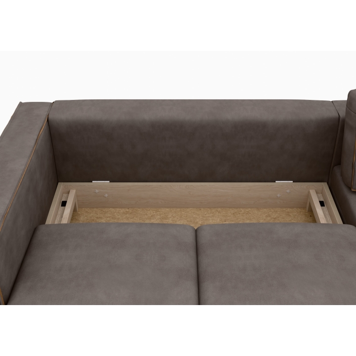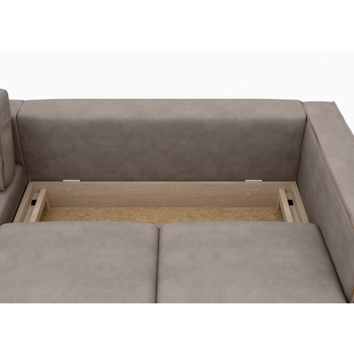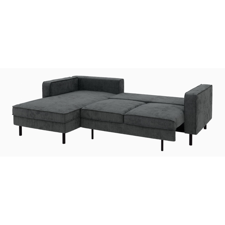 Narożnik Watkins wyposażony jest w funkcję spania typu DL oraz pojemnik na pościel, co czyni go meblem dostosowanym zarówno do relaksu w ciągu dnia, jak i do okazjonalnego nocnego wypoczynku. Powierzchnia spania wynosi 204 x 108 cm, co zapewnia przestrzeń dla dwóch osób. Pojemnik pozwala na wygodne przechowywanie kołdry i poduszek, oszczędzając miejsce w szafach.