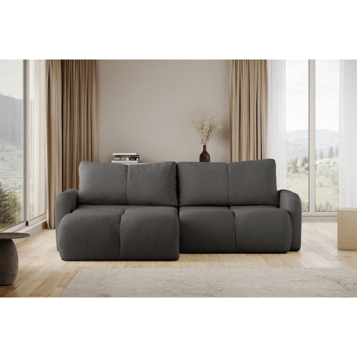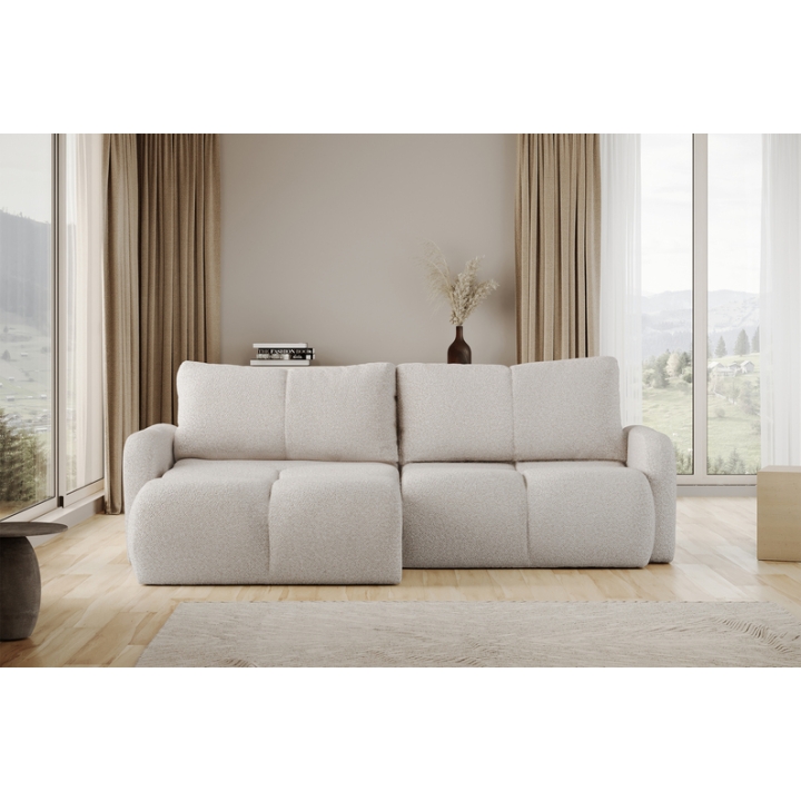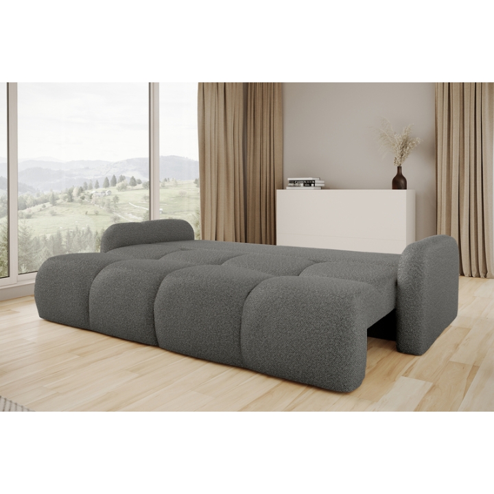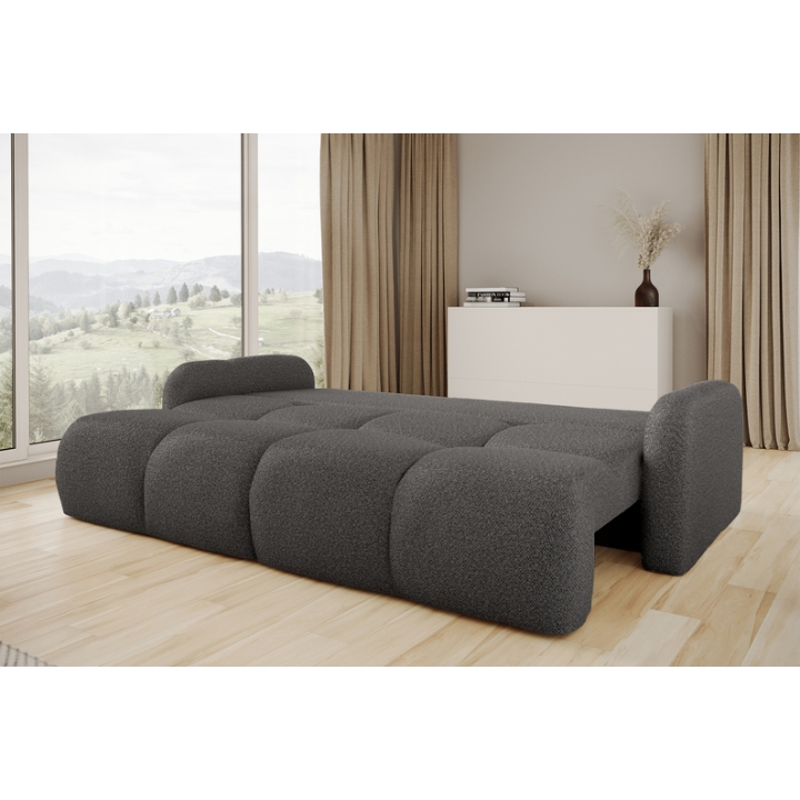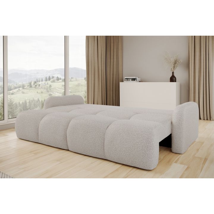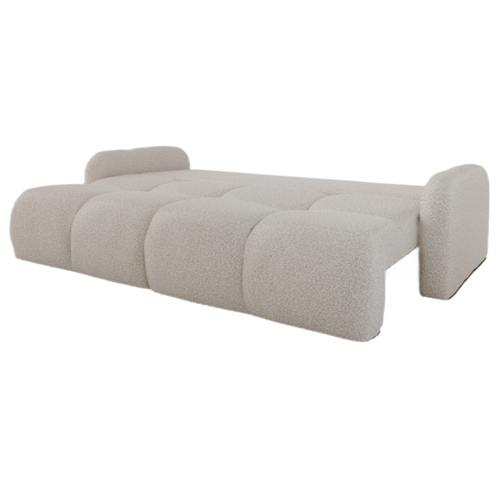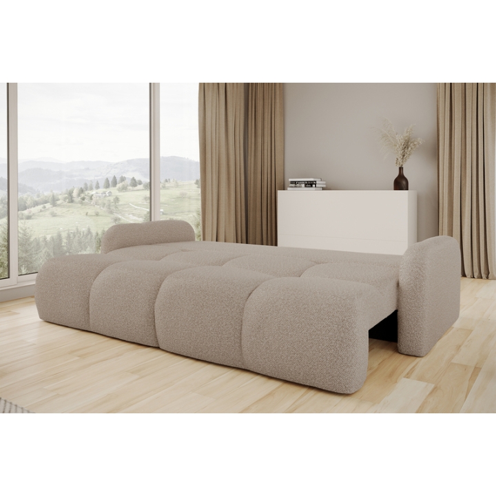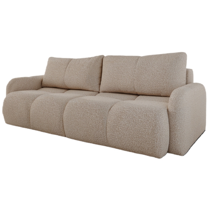 Mechanizm spania typu DL umożliwia sprawne przekształcenie sofy w pełnowymiarowe miejsce do nocnego odpoczynku. System polega na wysunięciu siedziska do przodu i złożeniu oparcia na powstałej powierzchni, co tworzy równą przestrzeń do spania o wymiarach 142x200 cm. Rozkładanie odbywa się płynnie i nie wymaga dużego wysiłku, co czyni tę funkcję odpowiednią nawet przy codziennym użytkowaniu. Dodatkowym atutem jest pojemnik na pościel ukryty w konstrukcji, który ułatwia przechowywanie kołdry, poduszek czy koca.