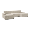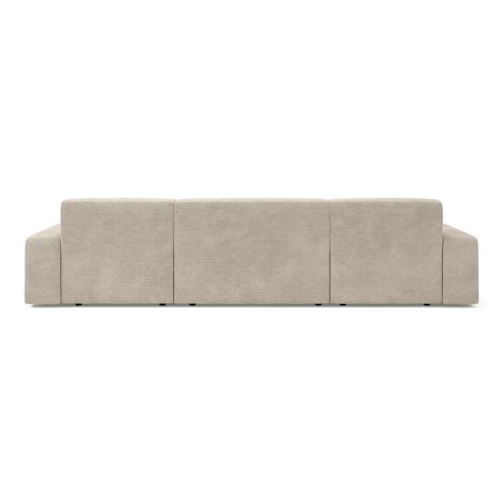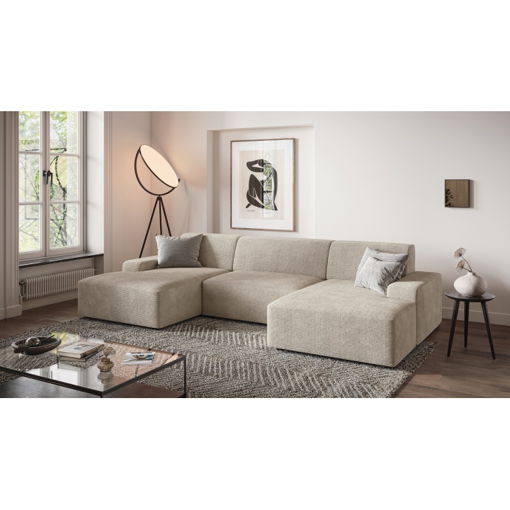Atutem narożnika jest pojemnik na pościel, który może zostać umieszczony po lewej lub prawej stronie, w zależności od układu pomieszczenia. Dzięki temu mebel sprawdza się nie tylko jako centralny punkt salonu, lecz również jako rozwiązanie pozwalające utrzymać porządek i oszczędzić przestrzeń. Choć narożnik nie posiada funkcji spania, istnieje możliwość rozbudowy konfiguracji o puf, który uzupełnia lukę między szezlongami.