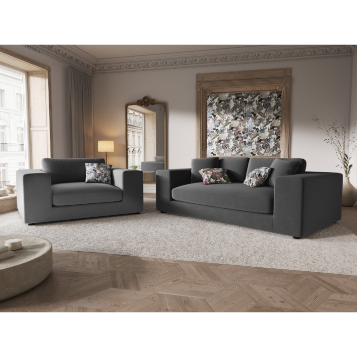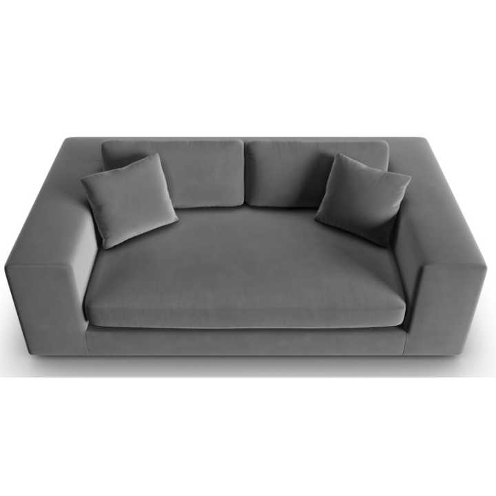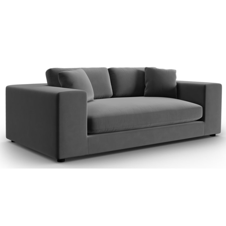 Pokrycie sofy dostępne jest w różnych głębokich odcieniach aksamitnej tkaniny, które wprowadzają do wnętrza wyrafinowany klimat. Aksamitna faktura materiału nie tylko jest przyjemna w dotyku, ale również wykazuje odporność na zużycie, co zapewnia meblowi długowieczność. Gruba i mięsista struktura wpływa na elegancję mebla. Włosie tkaniny układa się w różne strony przez co nadaje delikatnego połysku i efektu cieniowania na powierzchni. Dodatkowo, zastosowana tkanina jest łatwa w pielęgnacji, co zwiększa jej komfort w codziennym użytkowaniu a trwałość podkreśla test Martindale na poziomie 100000 cykli odporności na tarcie. Dwie poduszki ozdobne w zestawie.