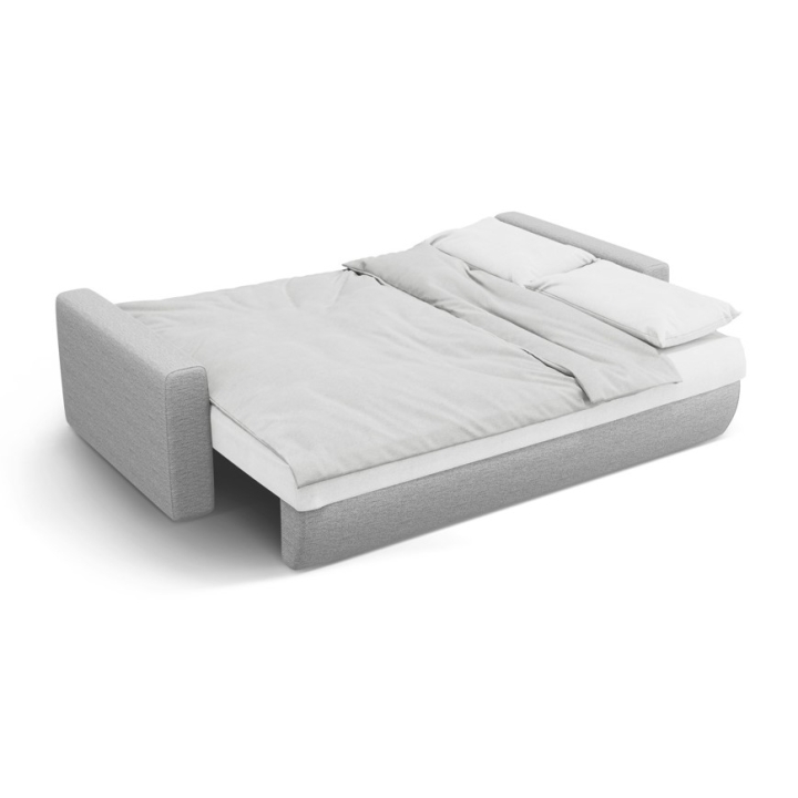 Siedzisko wykonane z pianki poliuretanowej o gęstości 30 kg/m³ oraz waty 200 g/m² w połączeniu ze sprężynami falistymi gwarantuje wysoki komfort i odporność na odkształcenia. Oparcie wypełnione pianką ciętą i silikonem zapewnia wygodne podparcie pleców. Funkcja spania o powierzchni 200 × 155 cm pozwala na komfortowy wypoczynek, a pojemnik na pościel zwiększa użytkowość mebla, ułatwiając przechowywanie dodatkowych tekstyliów.