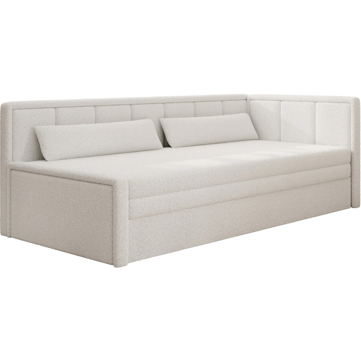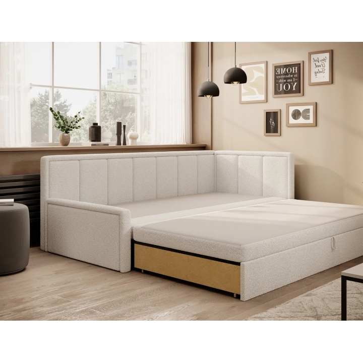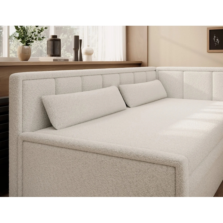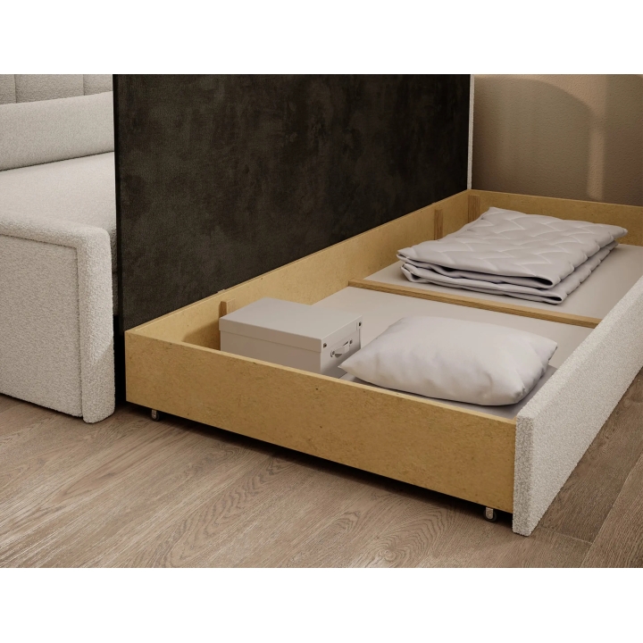 Oprócz funkcji spania sofa skrywa również pojemny schowek na pościel, umieszczony pod siedziskiem. Taka przestrzeń ułatwia przechowywanie kołdry, poduszek czy innych tekstyliów, co pozwala zachować ład w otoczeniu. To praktyczne rozwiązanie może być szczególnie przydatne w pomieszczeniach, w których każdy centymetr miejsca ma znaczenie.