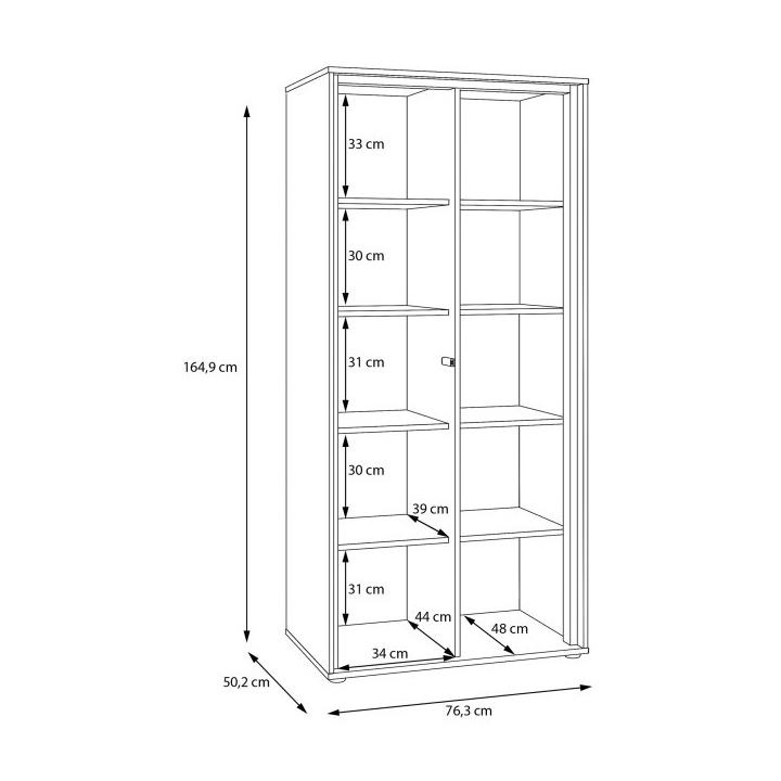 Struktura regału oparta jest na płycie wiórowej, z dodatkowymi wzmocnieniami obrzeżami ABS w wybranych elementach, co przekłada się na trwałość i odporność na uszkodzenia mechaniczne. Produkt nie posiada uchwytów – otwieranie drzwi odbywa się za pomocą systemu „push to open”, co ułatwia obsługę. Regał zawiera także 1 drzwiczki, 6 półek z płyty oraz 2 wieńce środkowe, co rozszerza możliwości jego wykorzystania.