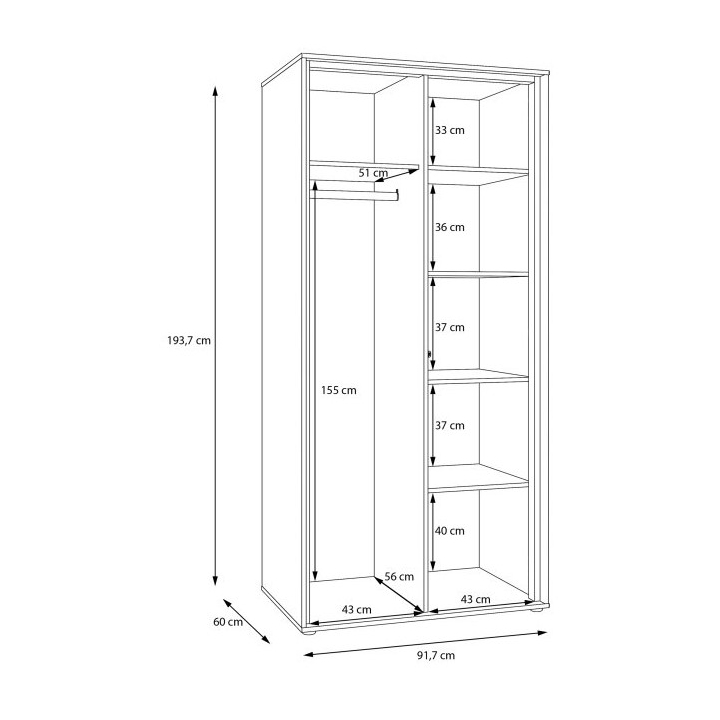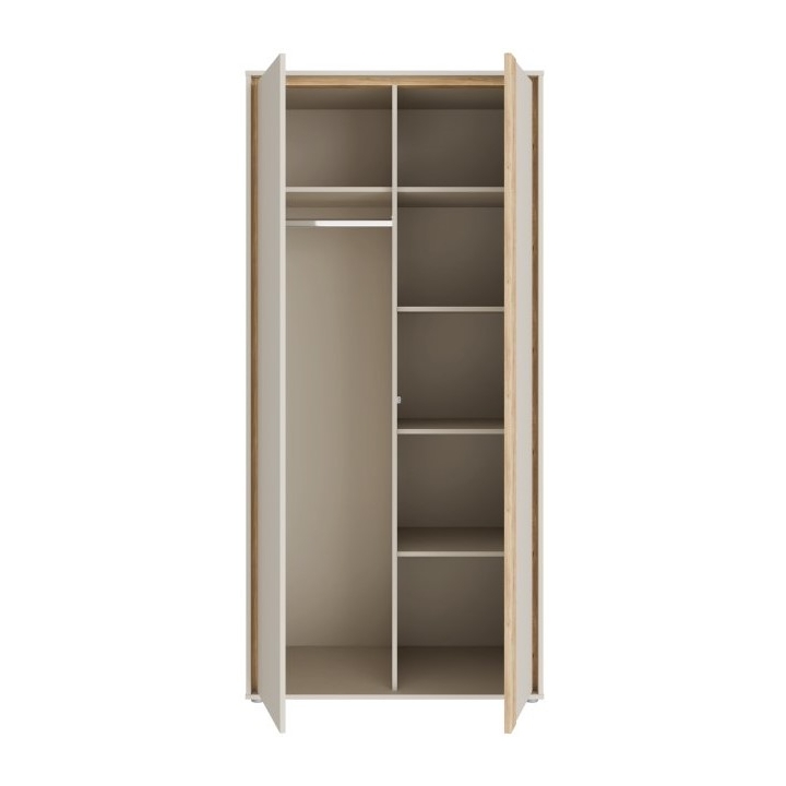 Mebel wyposażono w 2 uchylne drzwi, za którymi znajduje się przestrzeń do przechowywania ubrań i dodatków. Wewnątrz użytkownik znajdzie 3 półki z płyty, które wytrzymują obciążenie do 15 kg każda, oraz drążek na wieszaki, którego maksymalny udźwig wynosi 25 kg. Dodatkowym wzmocnieniem konstrukcji są 2 wieńce środkowe, stabilizujące całość i poprawiające rozkład ciężaru przechowywanych przedmiotów.