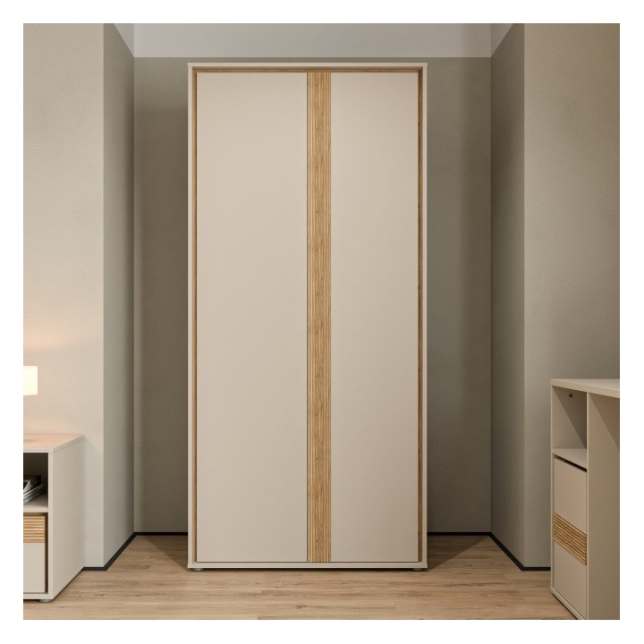 Zestawienie kolorystyczne Piaskowy/Dąb Mauvella dobrze komponuje się z naturalnym oświetleniem oraz jasnymi i ciemnymi tonacjami ścian. Kolorystyka produktu to beżowy i brązowy, co sprawia, że szafa może stać się wyraźnym, lecz spójnym elementem w wielu typach wnętrz. Jej powierzchnie są łatwe w utrzymaniu czystości, a konstrukcja sprzyja uporządkowanemu przechowywaniu odzieży.