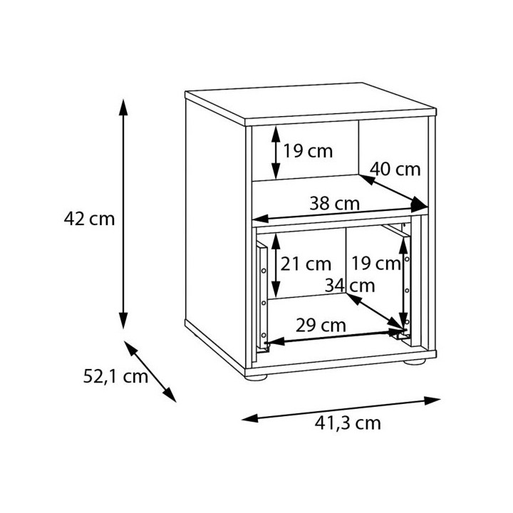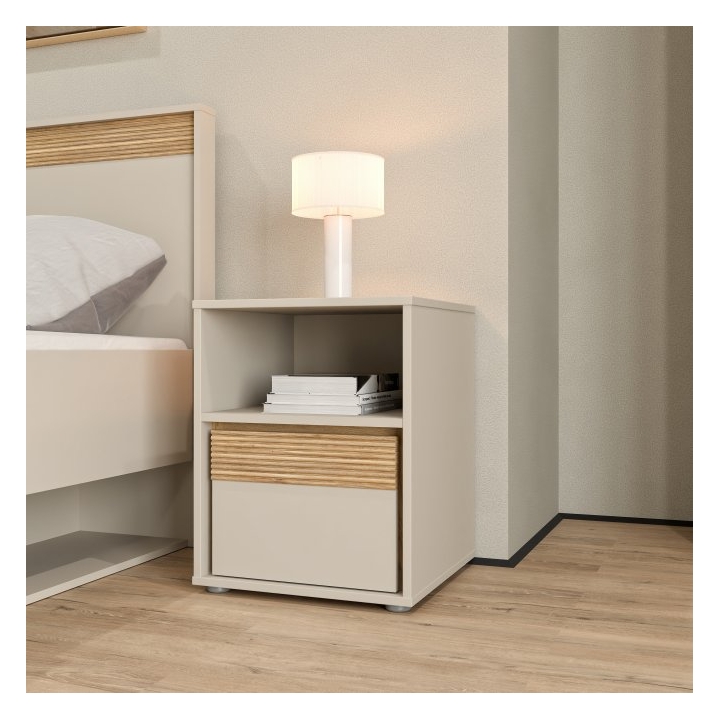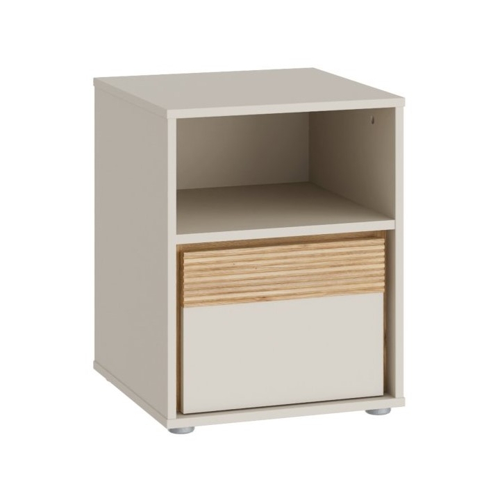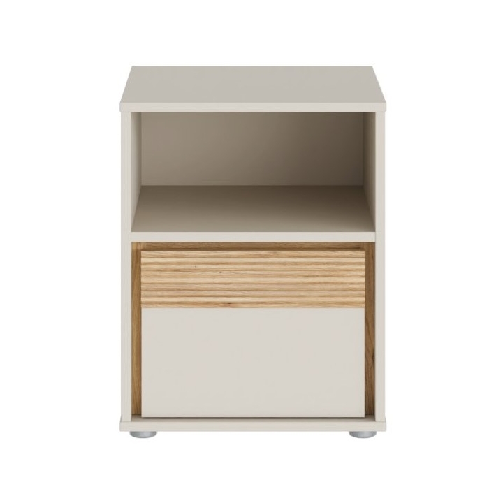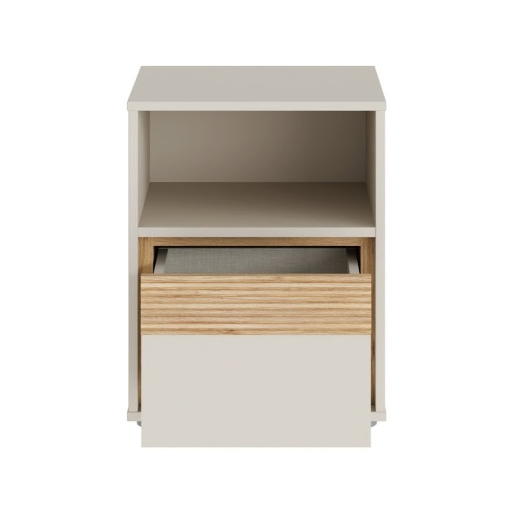 Model wyposażono w jedną szufladę oraz jedną otwartą półkę, co umożliwia przechowywanie przedmiotów codziennego użytku w sposób uporządkowany. Zastosowany mechanizm Quadro Push open eliminuje potrzebę uchwytów, dzięki czemu całość zachowuje czystą formę i spójność. Dodatkowym elementem konstrukcyjnym jest jeden wieniec środkowy, który wzmacnia mebel od wewnątrz.