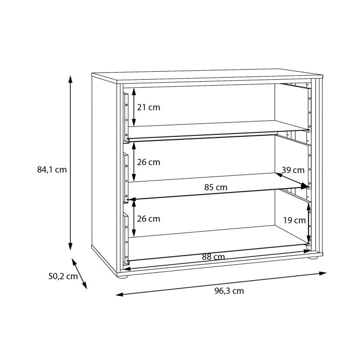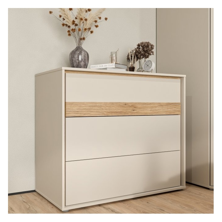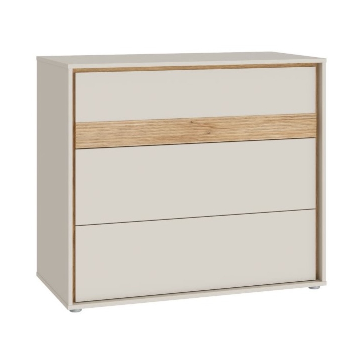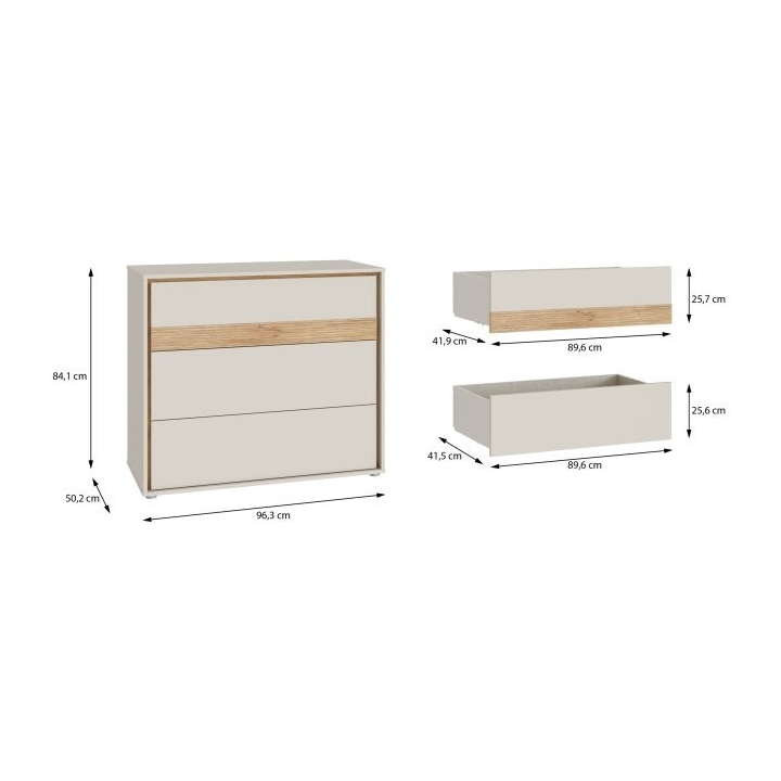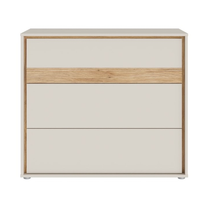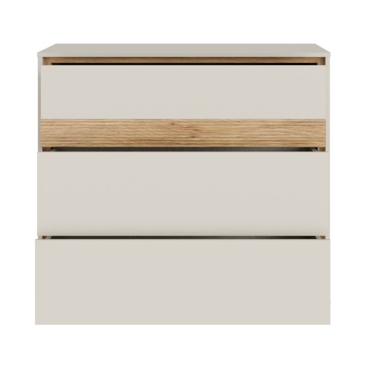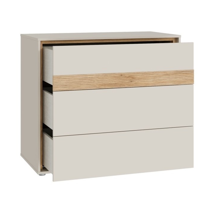 Komoda wyposażona jest w trzy pojemne szuflady, które otwierają się za pomocą systemu Push to Open na prowadnicach Quadro. Każda z szuflad może udźwignąć do 5 kg, co wystarcza na przechowywanie ubrań, dokumentów lub innych domowych przedmiotów. Brak uchwytów dodatkowo podkreśla nowoczesny charakter i upraszcza codzienne użytkowanie.