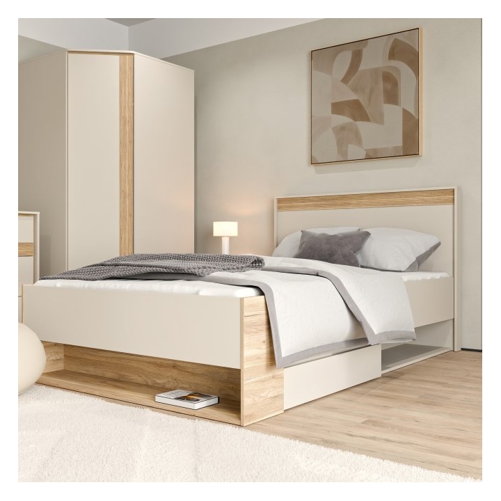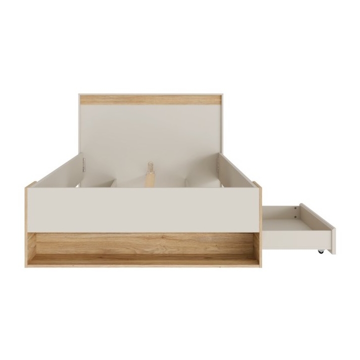 Mebel wykonano z solidnej płyty wiórowej, zastosowanej zarówno na bokach, jak i froncie. Łóżko wyposażono w jedną szufladę na prowadnicach Quadro Push open, o maksymalnym obciążeniu 5 kg, co pozwala na wygodne przechowywanie drobnych przedmiotów. Stabilność zapewniają nogi z tworzywa sztucznego w kolorze szarym i czarnym.