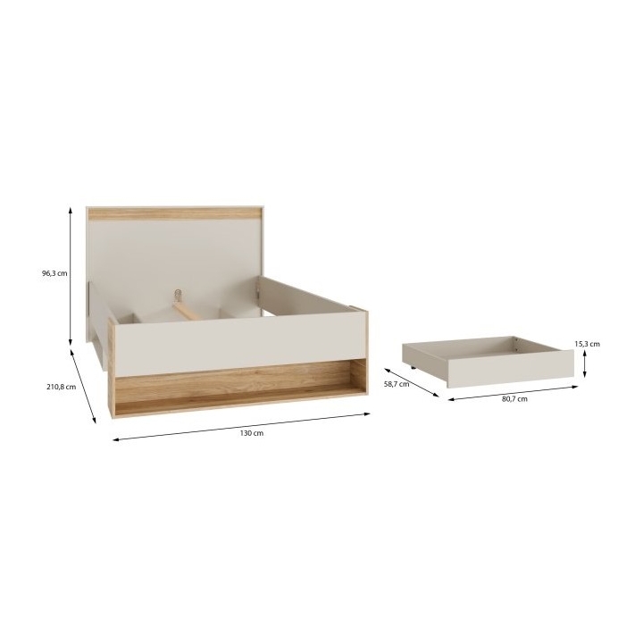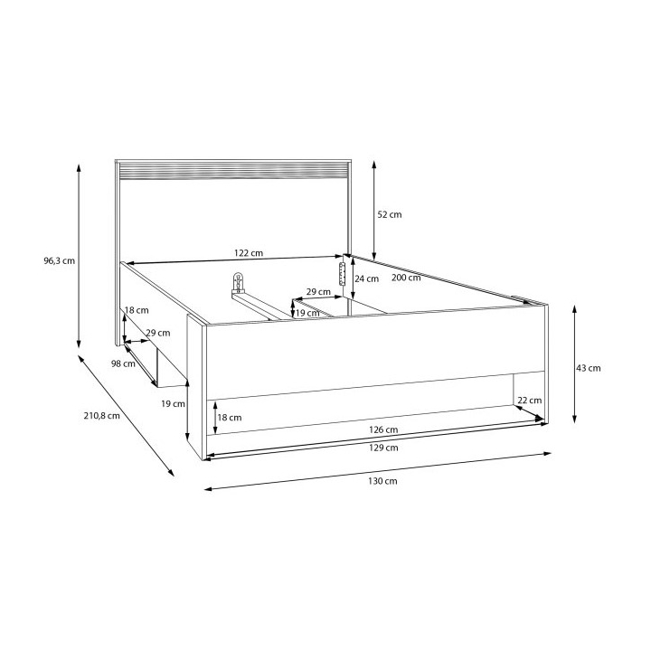 Łóżko Wexlin 120x200 cm zostało stworzone z myślą o nowoczesnych standardach funkcjonalnych i estetycznych. Model ten cechuje się starannie dopasowanymi wymiarami: 130 cm szerokości, 96,3 cm wysokości oraz 210,8 cm głębokości, dzięki czemu idealnie sprawdzi się w mniejszych pomieszczeniach. Wysokość zagłówka wynosi 96,8 cm, a niskiego szczytu 44,1 cm, co nadaje konstrukcji harmonijny wygląd.
