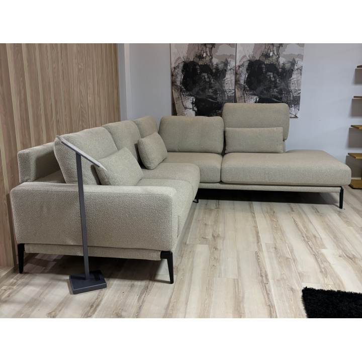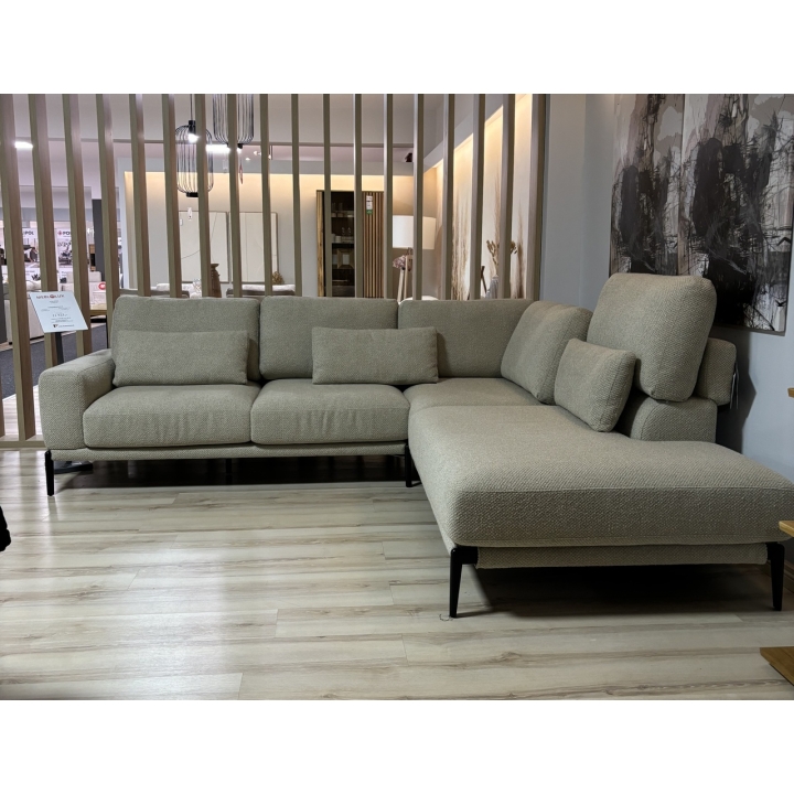 The structure of the corner sofa is set on 16 cm high black metal legs, which add lightness and make it easier to keep the furniture clean underneath. The modular layout provides a spacious seat and comfortable back support. The model has four backrest cushions and three smaller lumbar cushions, which adds to the comfort of use.