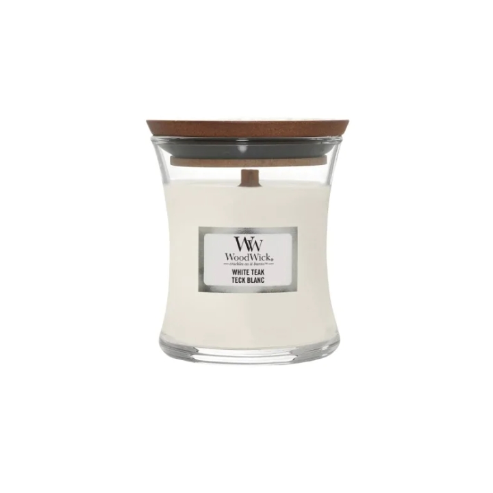 The small WoodWick White Teak candle is an atmospheric fusion of scent and sound, enclosed in a glass vessel with a weight of 85 g.