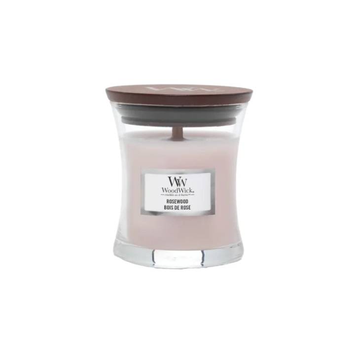 The small WoodWick Rosewood candle is an atmospheric combination of fragrance and sound, enclosed in a glass vessel with a weight of 85 g.