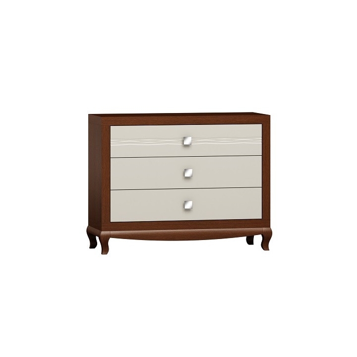 Features of the chest of drawers include classic styling, lacquered fronts decorated with delicate milling, wooden legs and metal handles.