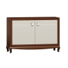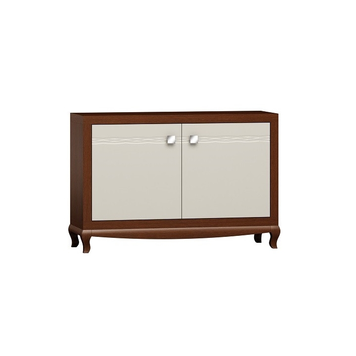 Characteristic features of the chest of drawers are its classic design, lacquered doors decorated with a delicate millwork, wooden legs and metal handles.