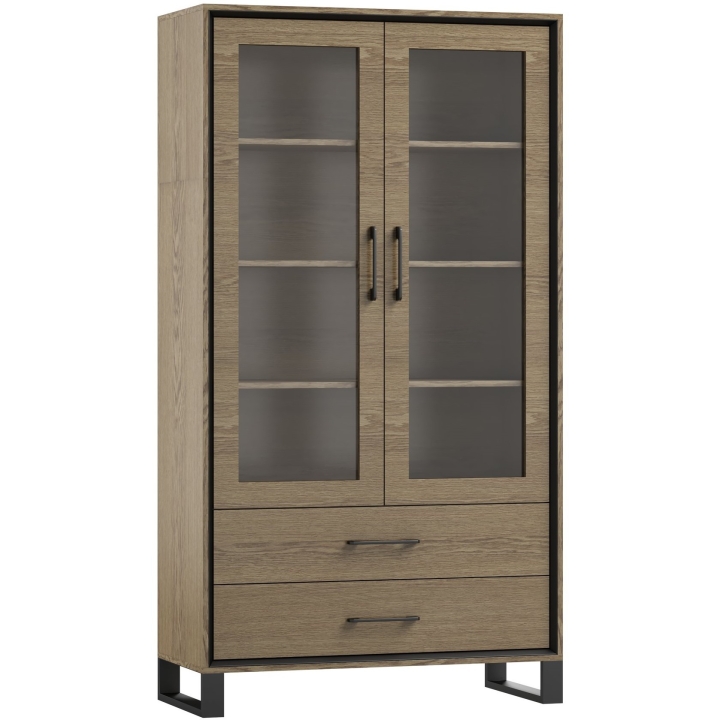 Features include a modern loft design, natural veneer construction, two glass doors and two drawers, a silent closing system, a frame and a metal handle in matt black.