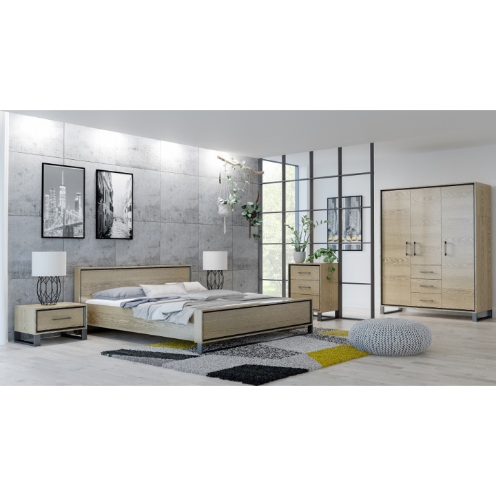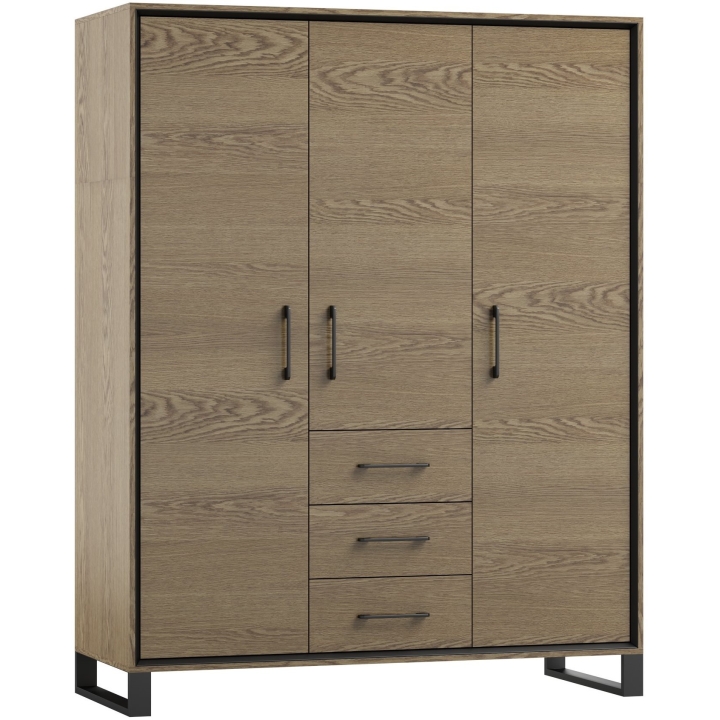 Features include a modern loft design, natural veneer construction, three doors and three drawers, a silent closing system, a frame and metal handles in matt black.