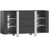 The Cromo CL04 chest of drawers from the manufacturer Art-Futuro is an ultra-modern style, high-gloss fronts contrasting with a matt body and intriguing inserts with a mirror finish. Not just a functional piece of furniture - it is a phenomenon to be admired. The fine styling with extremely deep gloss creates a delightful play of light. A unique design element that will enliven any interior. Made of high-quality laminated board, the chest of drawers guarantees long-lasting use. The chrome-coloured legs and handleless system make the furniture not only stylish but also functional. The glass shelves with backlighting will accommodate electronics, accessories and your record collection, filling the room with soft light, while the black-painted glass top is very easy to clean and catches the eye with its boundless depth of colour.