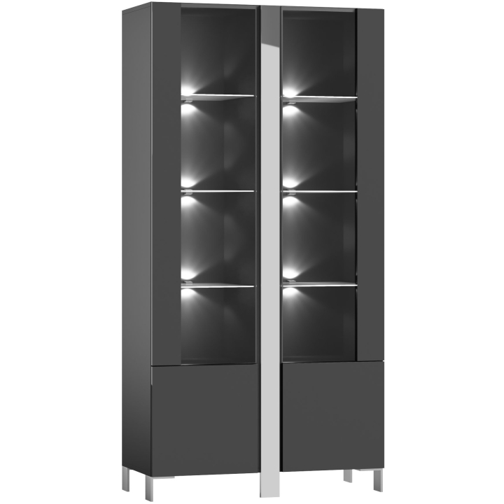 The Cromo CL08 showcase by the Art-Futuro manufacturer is an ultra-modern style, high gloss fronts contrasting with the matt body and intriguing inserts with a mirror finish. A unique design element that will enliven any interior. Made of high quality laminated board, the chest of drawers guarantees long-lasting use. Chrome-coloured legs and a handle-free system make the furniture not only stylish but also functional. The glass shelves with backlighting will accommodate electronics, accessories and your record collection, filling the room with soft light, while the black-painted glass top is very easy to clean and catches the eye with its boundless depth of colour.