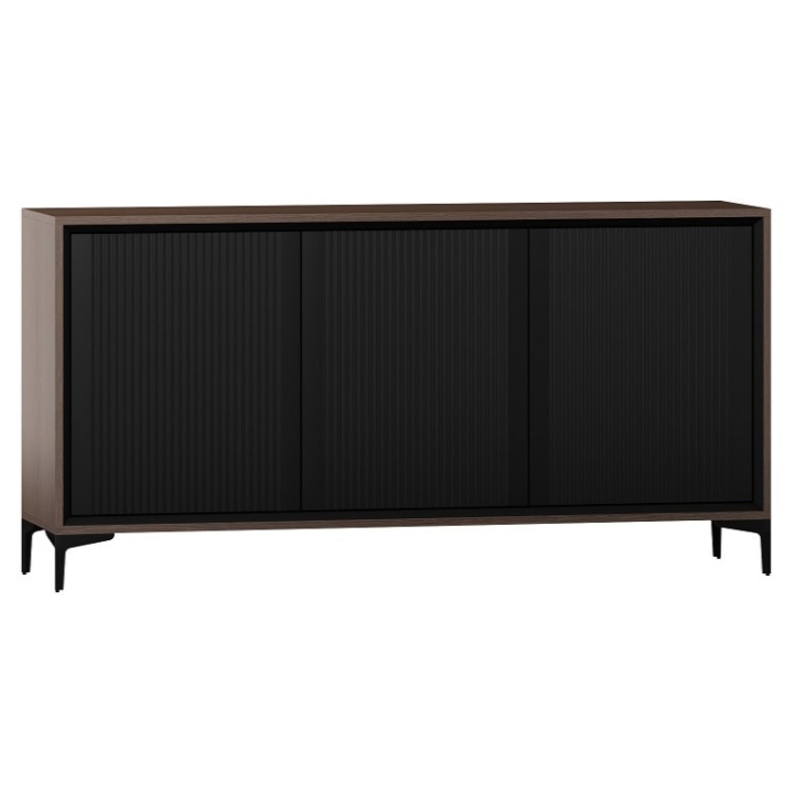 Features include a modern design with an industrial feel, lacquered fluted fronts, a cool brown oak veneer body and a handleless door opening system.