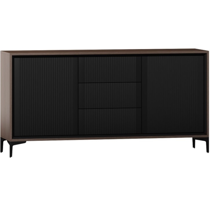 Features include a modern design with an industrial feel, lacquered fluted fronts, a cool brown oak veneer body and a handleless door and drawer opening system.