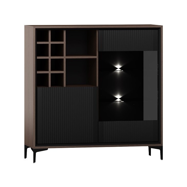 The Linea LN09 show case was created with modern design trends in mind and looks great in an industrial style interior, offering geometric simplicity with unique fluted fronts. A delightful combination of minimalism and thoughtful functionality. The oak veneered carcass and lacquered fronts in a matt black shade create an elegant and modern composition, while the glass display case with illuminated shelves draws the eye.