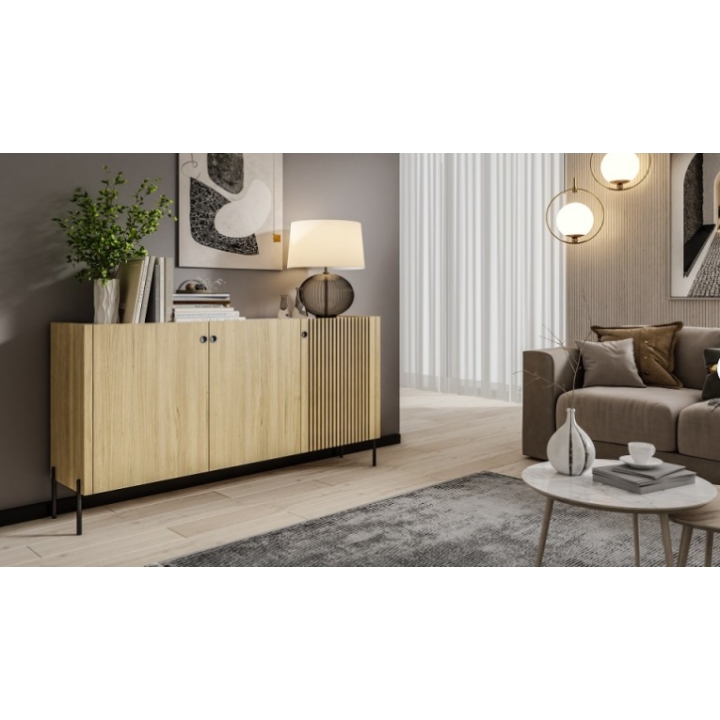 The Rennes collection is a stylish proposal from the Polish manufacturer Art-Futuro addressed to the most demanding customers. The design is based on simple shapes, broken in an intriguing way with lamellar fronts and slender metal legs inspired by loft style. The warm colour of uncoloured oak combined with black details and the stunning appearance of matt black decorated with gold accents create an eye-catching contrast. Quality workmanship and high-quality materials guarantee durability and many years of satisfaction with your purchase.