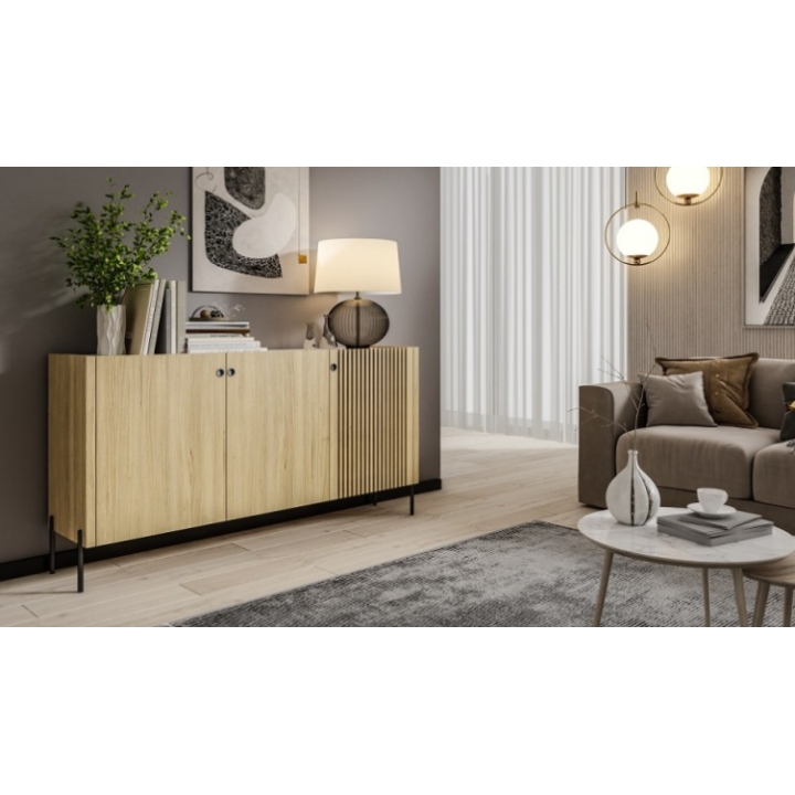 The Rennes collection is a stylish proposal from the Polish manufacturer Art-Futuro addressed to the most demanding customers. The design is based on simple shapes, broken in an intriguing way with lamellar fronts and slender metal legs inspired by loft style. The warm colour of uncoloured oak combined with black details and the stunning appearance of matt black decorated with gold accents create an eye-catching contrast. Quality workmanship and high-quality materials guarantee durability and many years of satisfaction with your purchase.