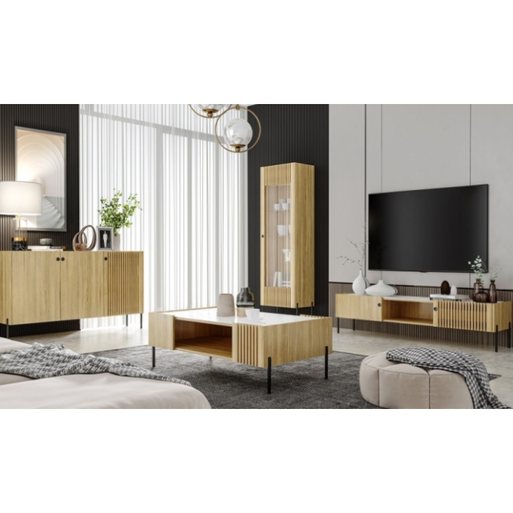 The Rennes collection is a stylish proposal from the Polish manufacturer Art-Futuro addressed to the most demanding customers. The design is based on simple shapes, broken in an intriguing way with lamellar fronts and slender metal legs inspired by loft style. The warm colour of uncoloured oak combined with black details and the stunning appearance of matt black decorated with gold accents create an eye-catching contrast. Quality workmanship and high-quality materials guarantee durability and many years of satisfaction with your purchase.