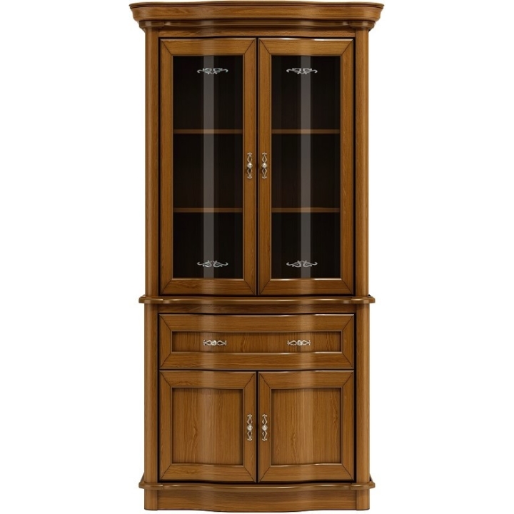 Discover unparalleled elegance and functionality in the Caren C14+C15 glass display cabinet, the perfect addition to your living room or lounge. The Caren system is an expression of timeless style, perfect for those who appreciate tradition and refined design. The furniture's characteristic bold sides and rims guarantee solidity and comfort of use, emphasising its unique character. The display cabinet is made of oak veneer, which ensures not only an aesthetically pleasing appearance, but also durability and resistance to damage. Curved fronts add elegance and a sense of luxury to the collection, creating a harmonious composition in any interior. Handles in the colour of old gold and a semi-gloss finish add to the product's unique charm and exclusive character. The two glazed doors expose the solid shelves inside and, thanks to the soft-close system, they close gently and quietly. The drawer with bent front and laminated board box makes it easy to store items and provides convenient access thanks to its full extension. The furniture is also equipped with a pair of wooden doors. The Caren vitrine is not only a piece of furniture, it is also an expression of class and taste that is sure to enhance the aesthetic value of your interior.
