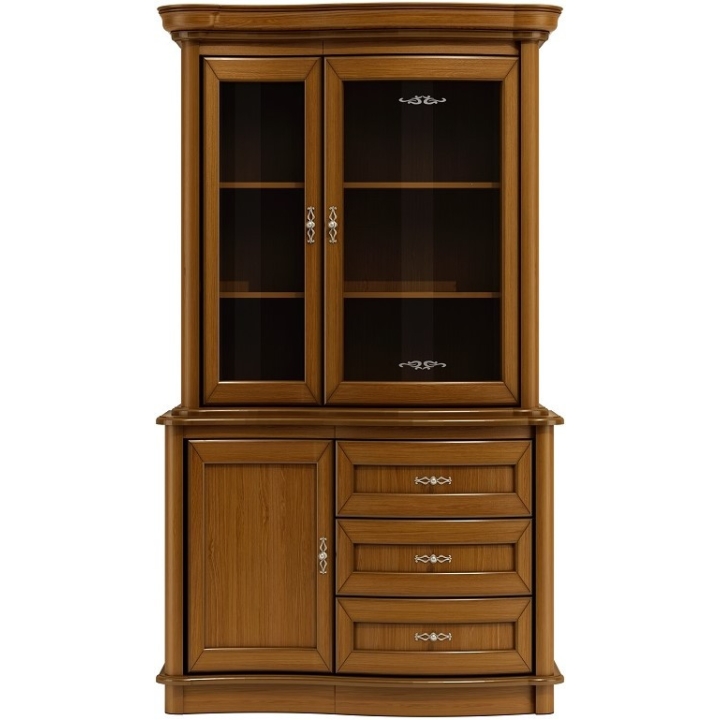 Features include classic styling, oak veneer construction with solid wood elements, curved fronts, glazed doors, full-extension drawers and metal handles in the colour of old gold.