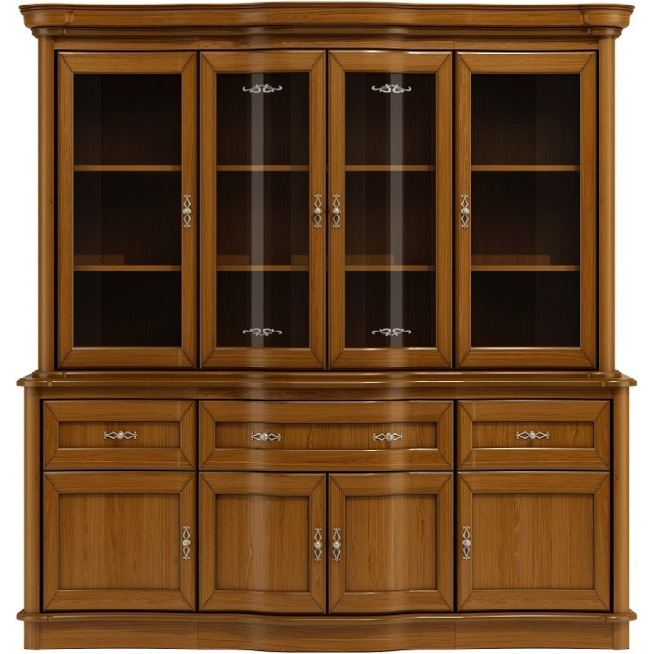 Discover unparalleled elegance and functionality in the Caren C24+C25 glass display cabinet, the perfect addition to your living room or lounge. The Caren system is an expression of timeless style, perfect for those who appreciate tradition and sophisticated design. The furniture's characteristic bold sides and rims guarantee solidity and comfort of use, emphasising its unique character. The display cabinet is made of oak veneer, which ensures not only an aesthetically pleasing appearance, but also durability and resistance to damage. Curved fronts add elegance and a sense of luxury to the collection, creating a harmonious composition in any interior. Handles in the colour of old gold and a semi-gloss finish add a unique charm and exclusive character. The four glazed doors expose the solid shelves inside and, thanks to the soft-close system, they close gently and quietly. Drawers with a curved front and a laminated board box make it easy to store items and provide convenient access thanks to the full extension. The product is also equipped with four wooden doors. The Caren vitrine is not only a piece of furniture, it is also an expression of class and taste that is sure to enhance the aesthetic value of your interior.