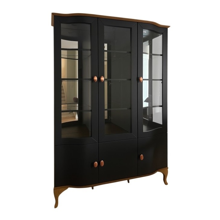The display cabinet features six doors, providing easy access and organized storage for various items. Soft-close hinges ensure quiet and smooth operation, enhancing everyday comfort. The design is completed with gold-colored steel handles, which serve as distinctive and stylish details.