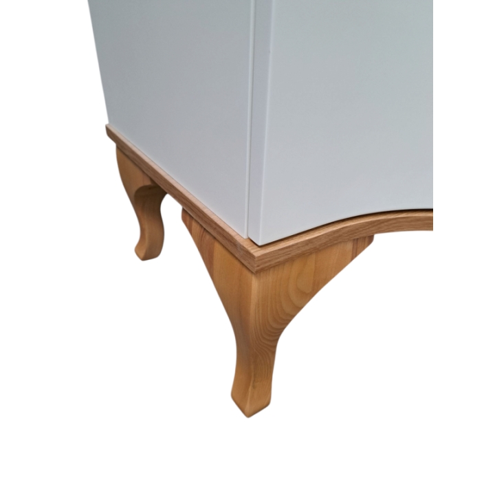 The body of the cabinet is made of natural, unstained oak, emphasizing its authentic character. The matte surface of the body creates a subtle contrast with the lacquered MDF fronts, giving the whole piece a harmonious appearance. The oak veneer top, coated with protective lacquer, not only highlights the wood’s natural texture but also ensures durability and resistance to daily use.