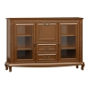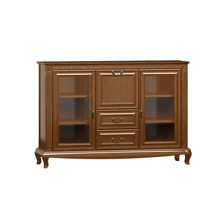 Features of the chest of drawers include a classic design with decorative milling and solid wood legs, a glazed door, an enclosed bar and spacious drawers.