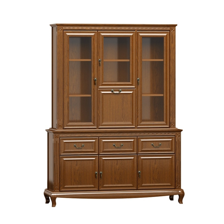 Features of the display cabinet include a stunning classic-style design, richly decorated oak veneer fronts and solid wood legs. Three glass doors offer space to display our treasures. Three wooden doors conceal even more space, and three handy drawers provide convenient storage for small items.