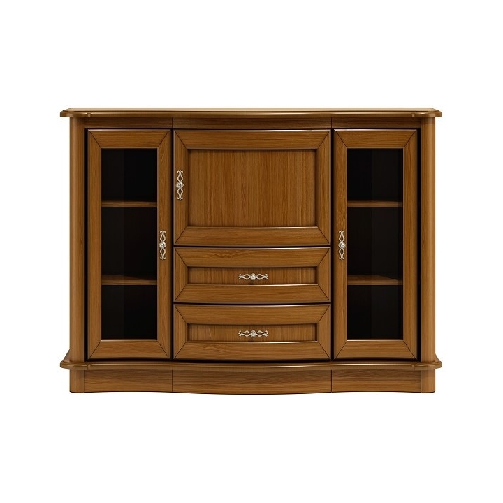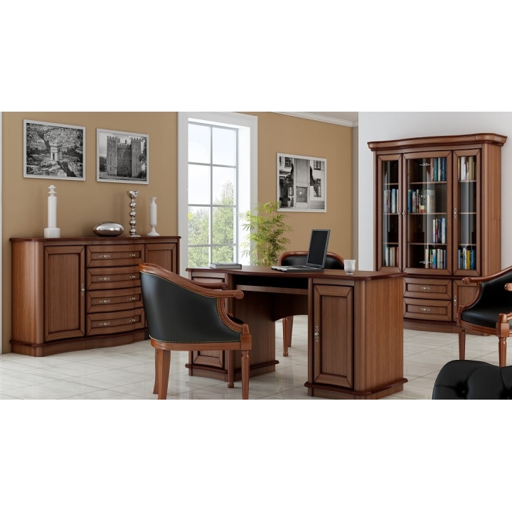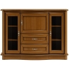 Features include classic styling, oak veneer construction with solid wood elements, curved fronts, glazed doors with a soft-close, full-extension drawers and metal handles in the colour of old gold.