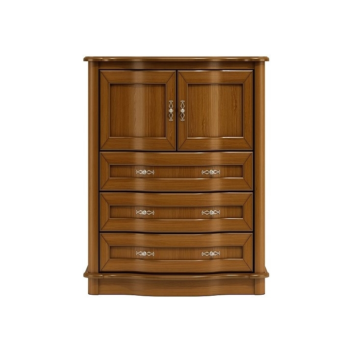 Discover unparalleled elegance and functionality with the Caren C09 chest of drawers, the perfect addition to your living room or lounge. The Caren system is an expression of timeless style, perfect for those who appreciate tradition and sophisticated design. The furniture's distinctive bold sides and rims guarantee solidity and comfort, emphasising its unique character. The chest of drawers is made of oak veneer, which ensures not only an aesthetically pleasing appearance, but also durability and resistance to damage. The curved fronts add elegance and a sense of luxury to the collection, creating a harmonious composition in any interior. Handles in the colour of old gold and a semi-gloss finish add a unique charm and exclusive character to the chest of drawers. The two doors conceal a spacious interior and close gently and quietly thanks to the soft-close system. Three drawers with a curved front and a laminated board box make it easy to store items, and convenient access is guaranteed by the full-extension system. The Caren chest of drawers is not only a piece of furniture, it is also an expression of class and taste that is sure to enhance the aesthetic qualities of your interior.