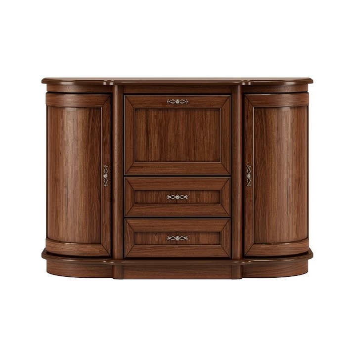 Features include classic styling with curved fronts, rounded body in natural veneer and solid wood, warm walnut colour, arched doors with a silent closing system, bar and drawers.