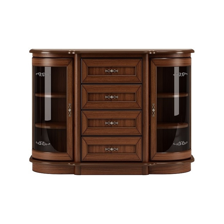 Features include classic styling with curved fronts, rounded body in natural veneer and solid wood, warm walnut colour, glazed doors with a silent closing system and drawers.