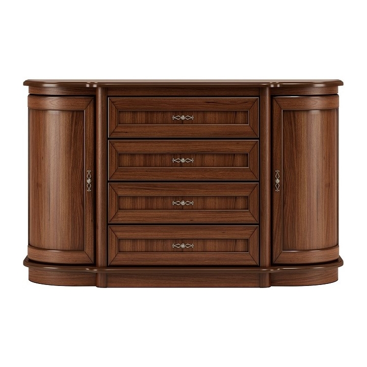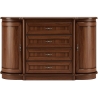 Features include classic styling with curved fronts, a rounded body in natural veneer and solid wood, a warm walnut colour scheme, curved doors with a silent closing system and drawers.
