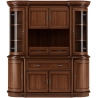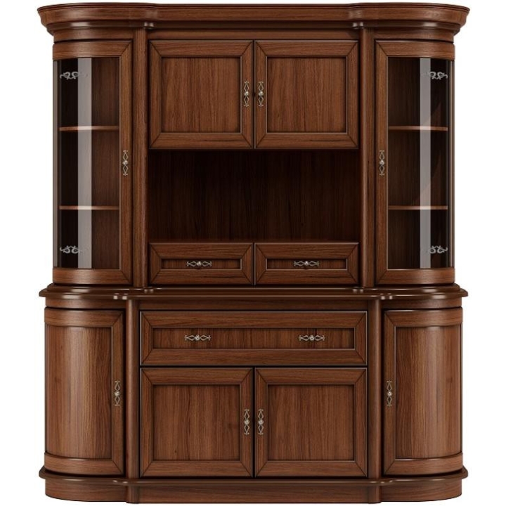 Features include a classic styling with curved fronts, a rounded body in natural veneer and solid wood, a warm walnut colour scheme, glazed and wooden doors with a silent closing system and three drawers.