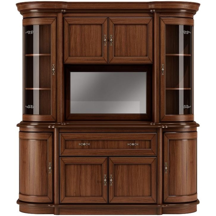 Features include a classic styling with curved fronts, a rounded body in natural veneer and solid wood, a warm walnut colour scheme, glazed and wooden doors with a silent closing system and three drawers.